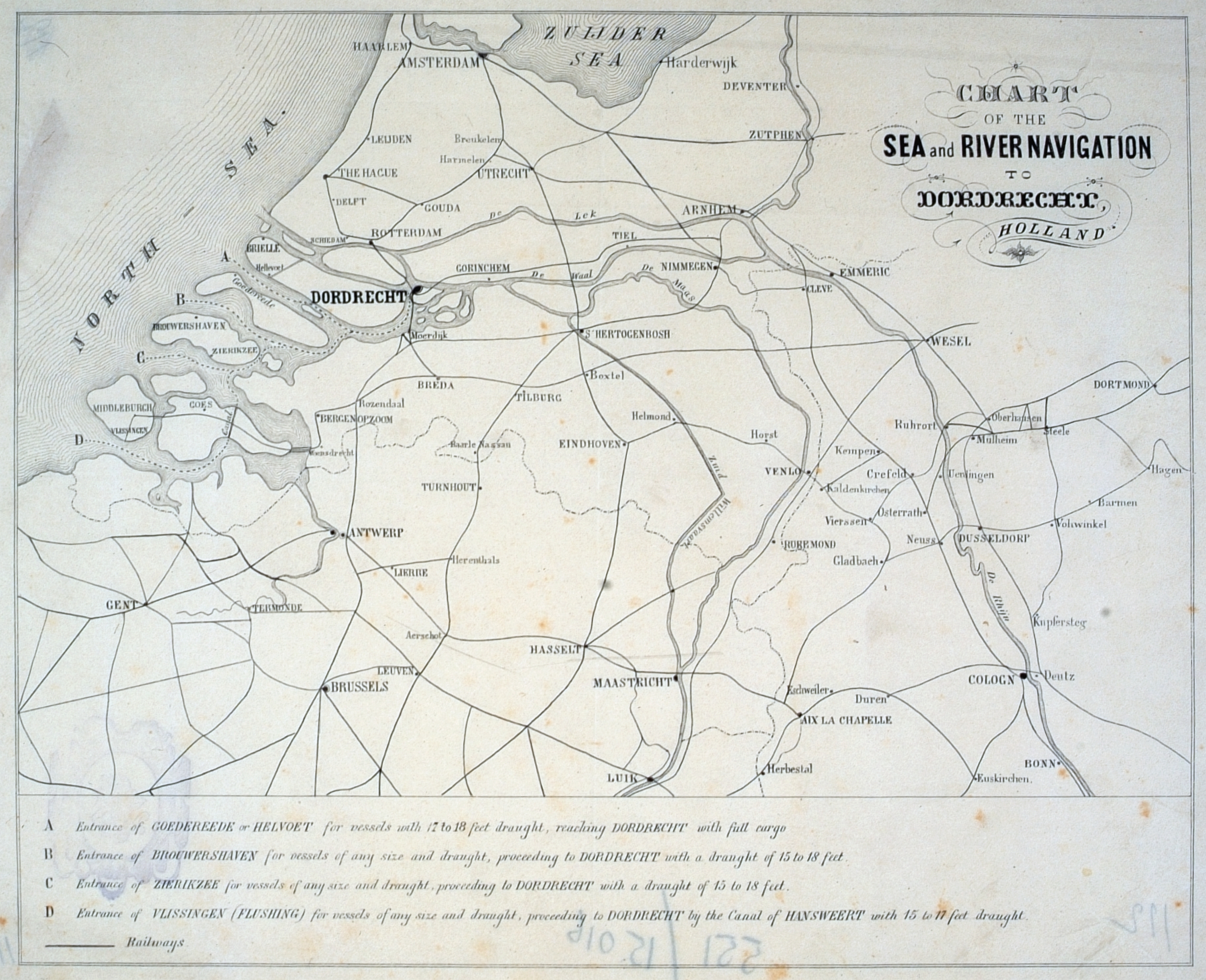 - Kaart met verbindingen tussen Dordrecht en de Noordzee; met opgave van afstanden.
