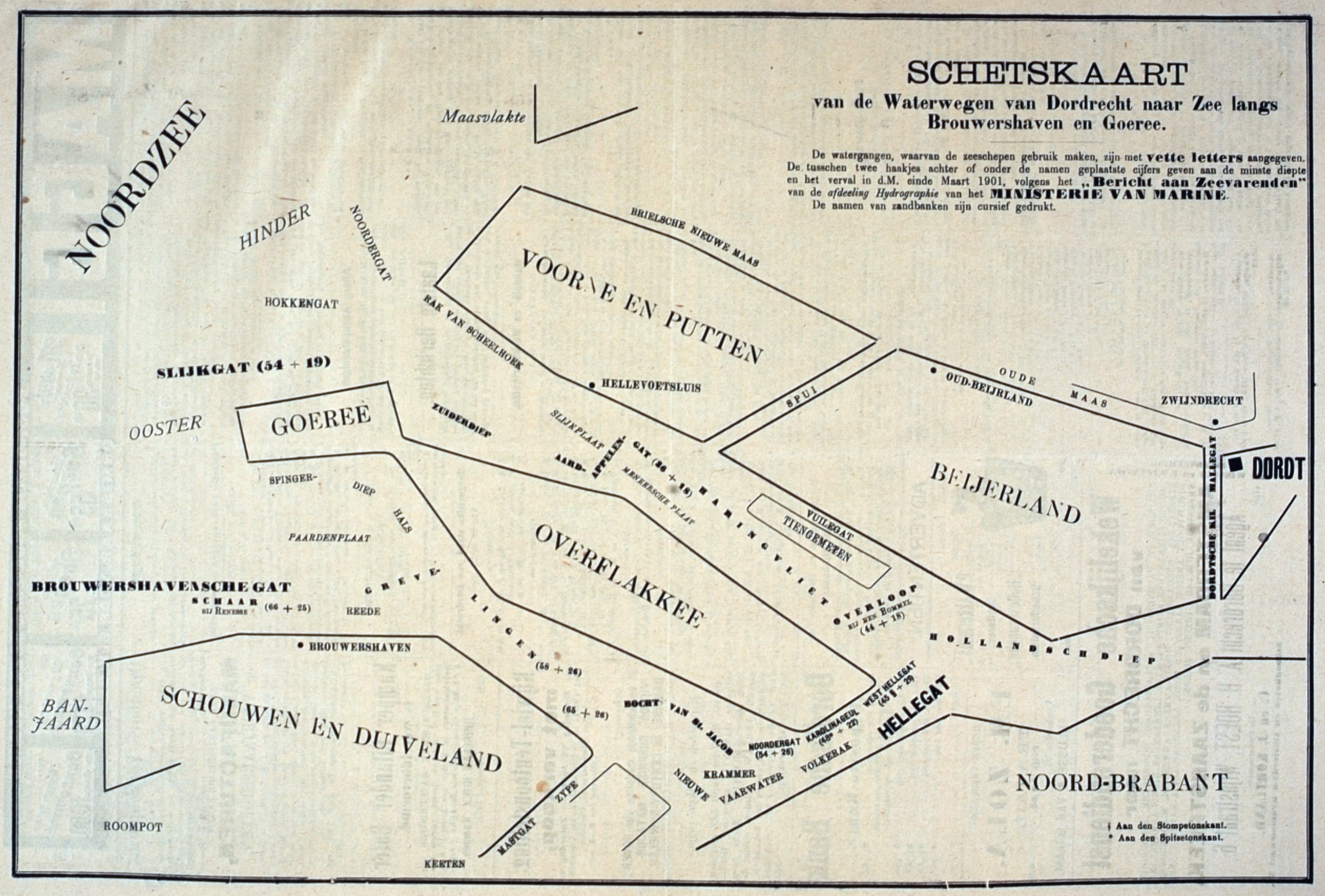 - Schetskaart van de waterwegen van Dordrecht naar zee langs Brouwershaven en Goeree.