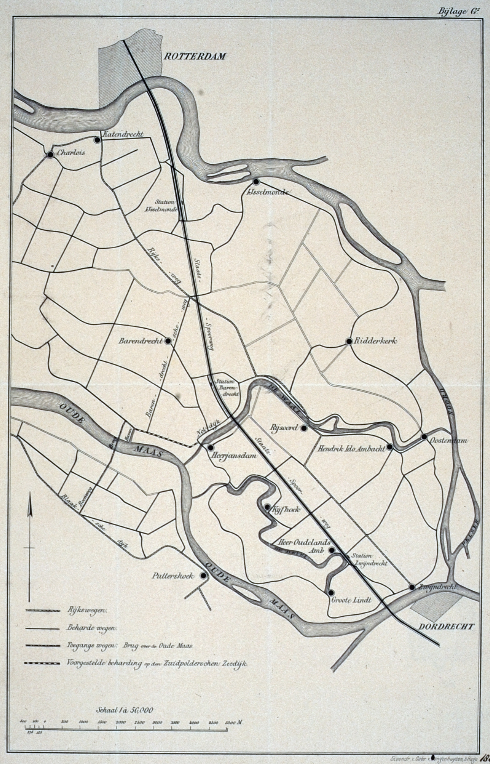 - Kaart van de verbinding van de tramwegnetten tussen de Hoekse en Zwijndrechtse Waard door een brug over de Oude Maas bij Barendrecht (rond 1889)