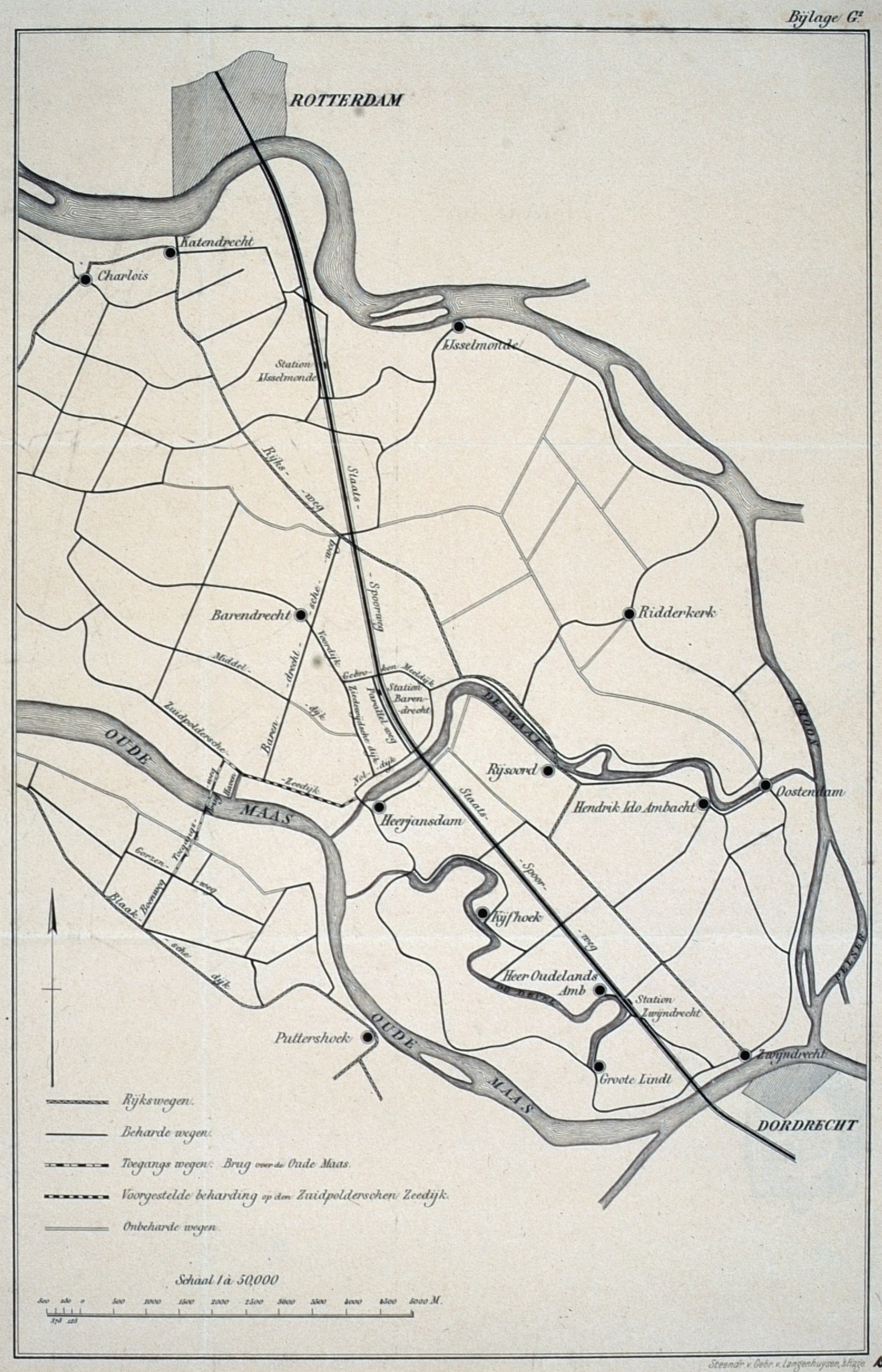 - Kaart van de verbinding van de tramwegnetten tussen de Hoekse en Zwijndrechtse Waard door een brug over de Oude Maas bij Barendrecht (rond 1889)