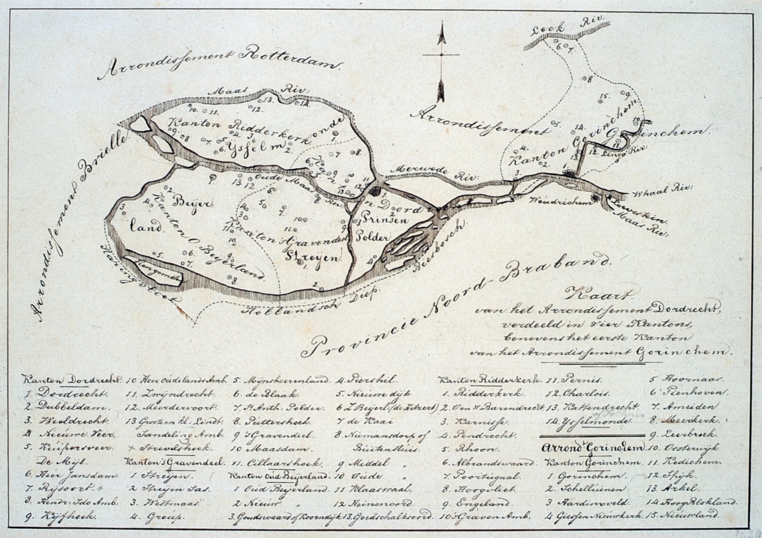 - Kaart van het arrondissement Dordrecht, verdeeld in vier kantons, en het eerste kanton van het arrondissement Gorinchem, volgens de rechterlijke organisatie van 2 Dec. 1828.