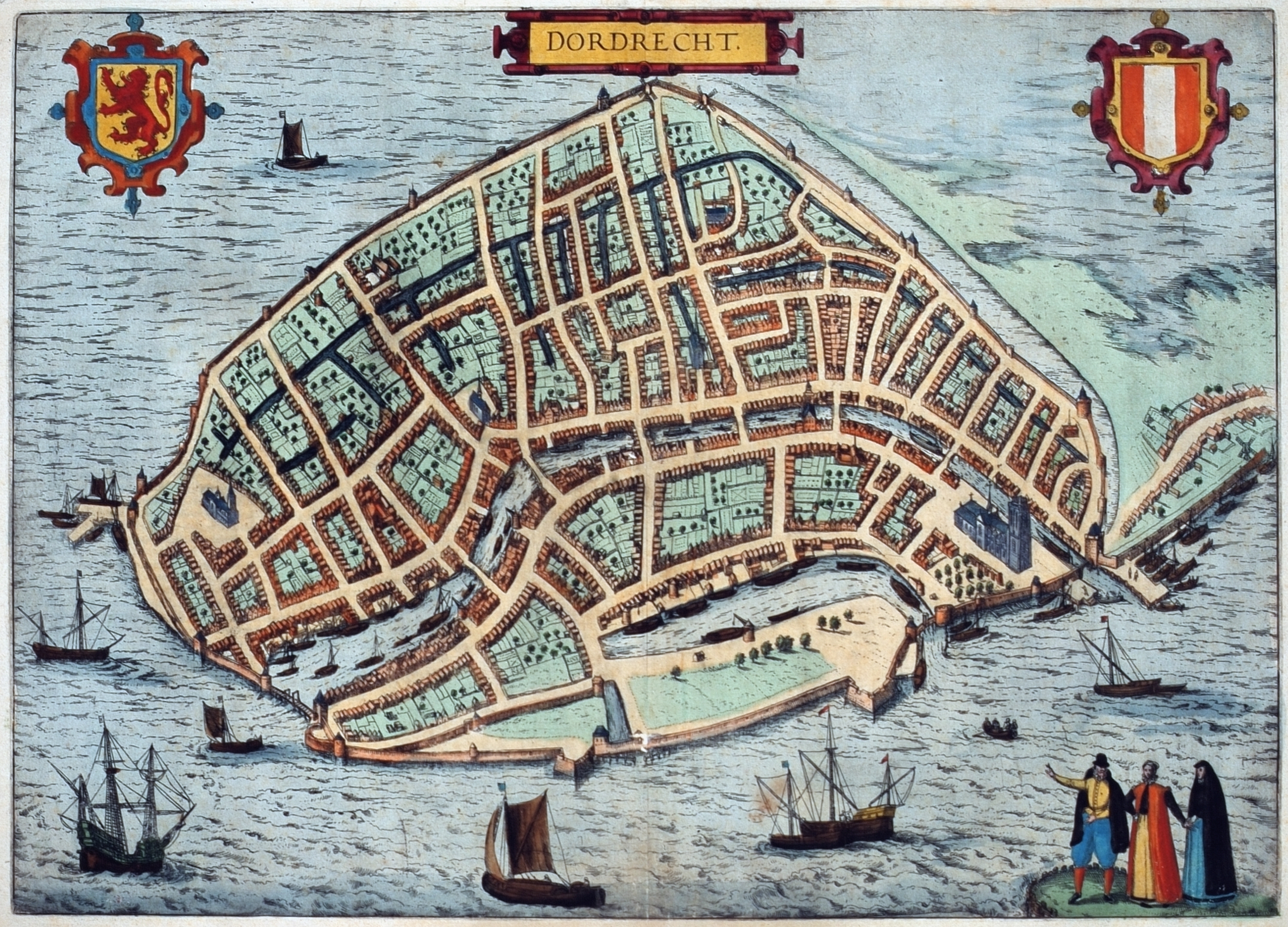Plattegrond van Dordrecht omstreeks 1572 met wapens van Holland en Dordrecht
