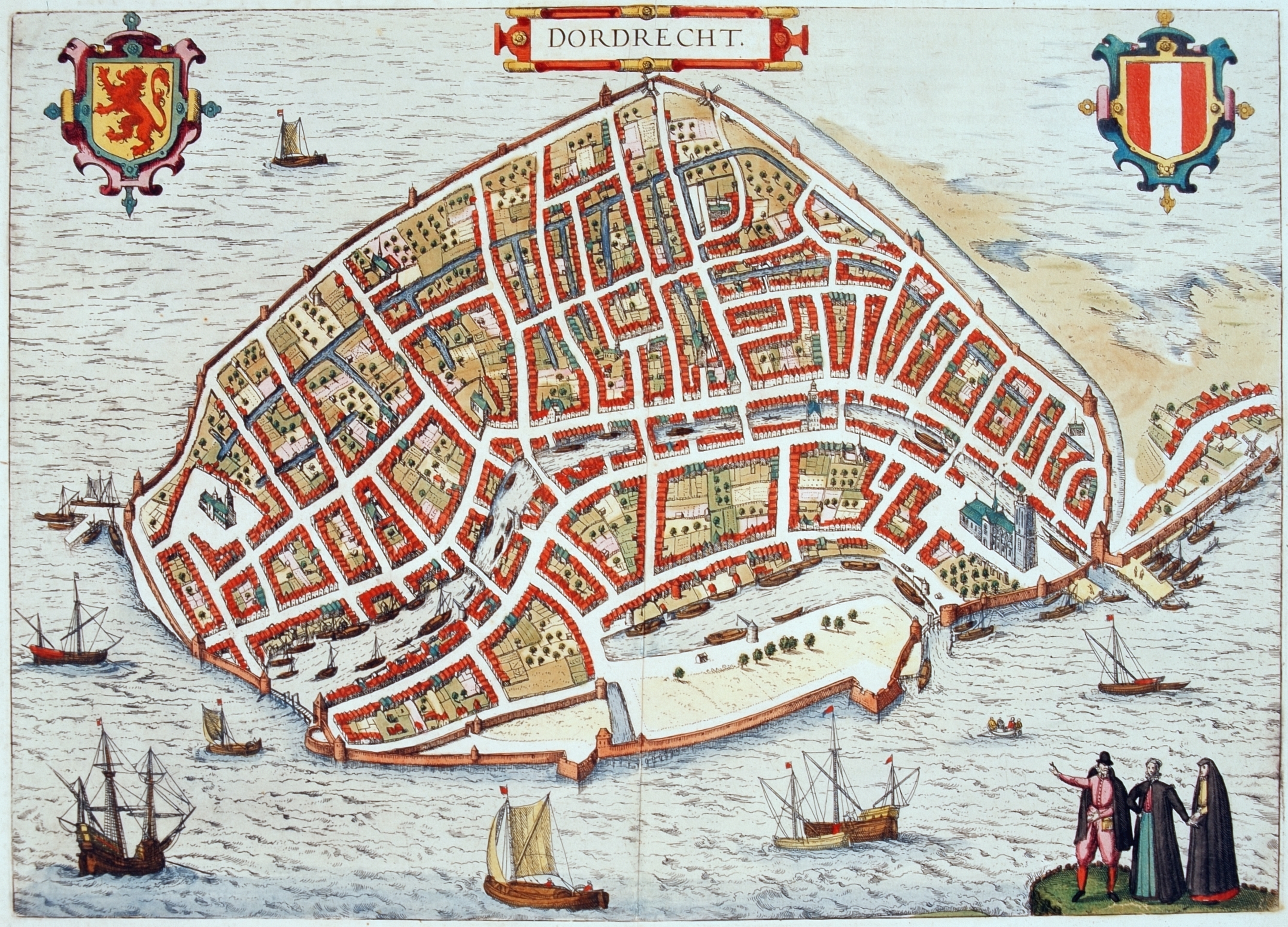 - Plattegrond van Dordrecht in 1572 met middenboven een cartouche met de naam, links het wapen van Holland, rechts dat van de stad en rechtsonder een man en twee vrouwen.