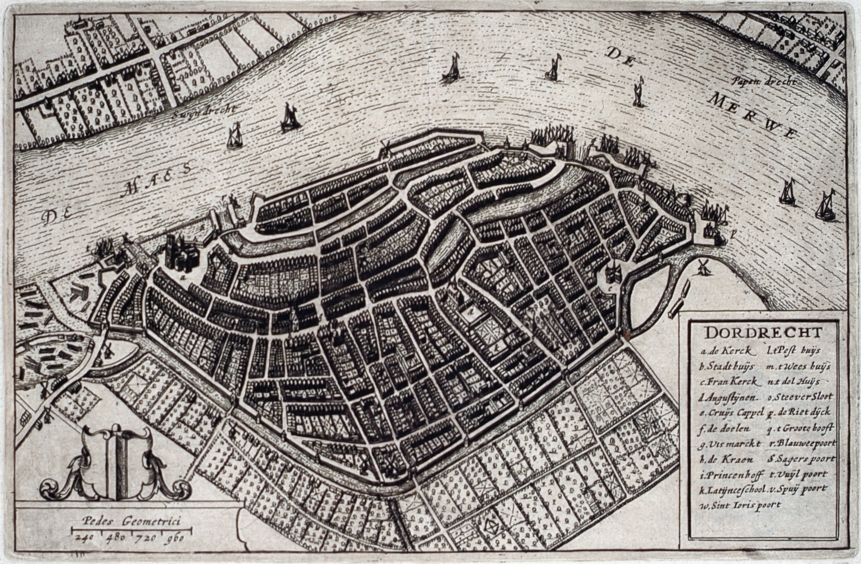 Plan van Dordrecht. Kaart met opschrift: 'Dordrecht'; links onderaan het stedelijk wapen en schaal en rechts de verklaring van de letters a - v