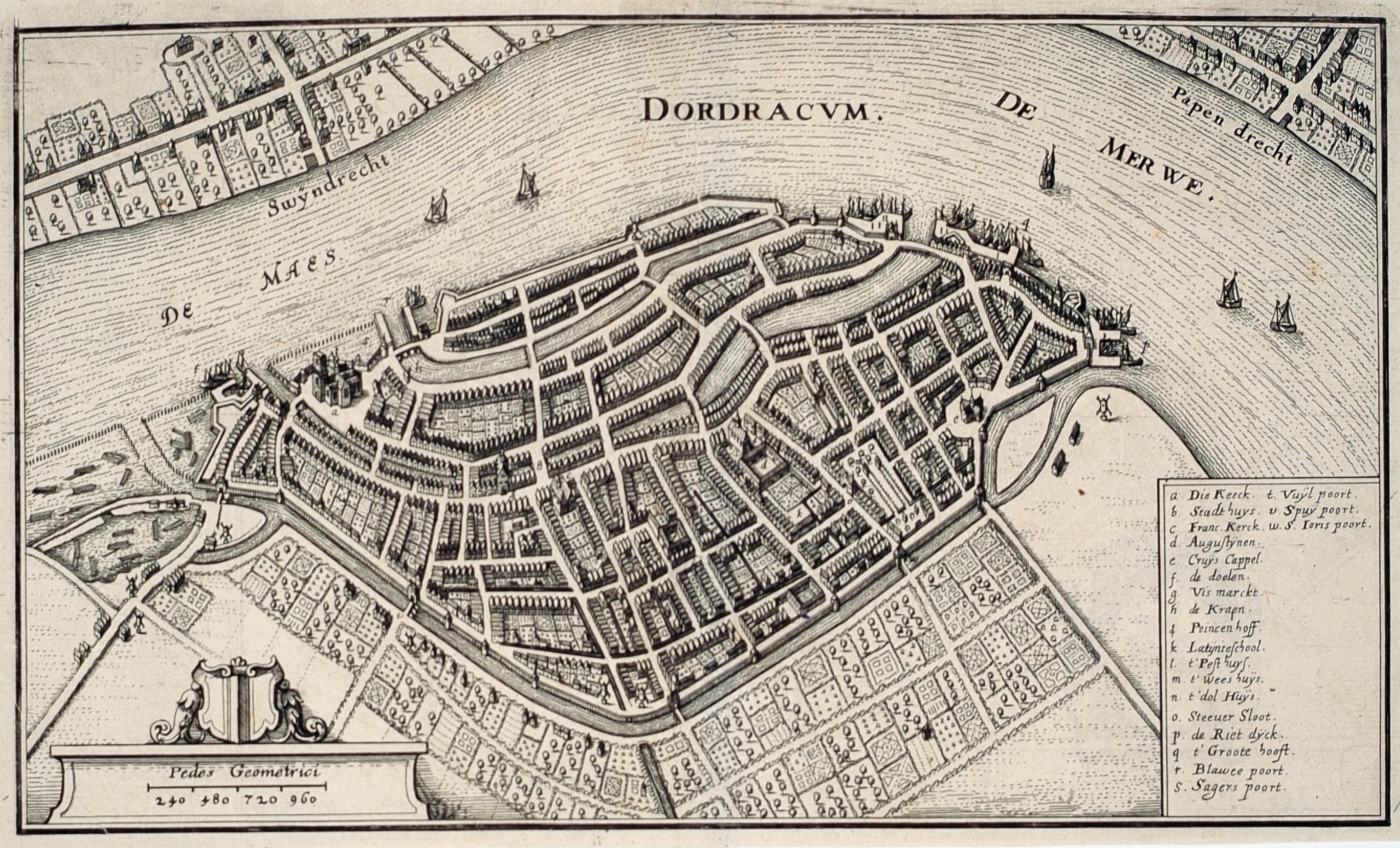 Plan van Dordrecht met inschrift 'Dordracum' en links het wapen met de schaal en rechts de verklaring van de letters a-v. De namen van Zwijndrecht en Papendrecht zijn hier in staande letter, op de vorige in cursief.