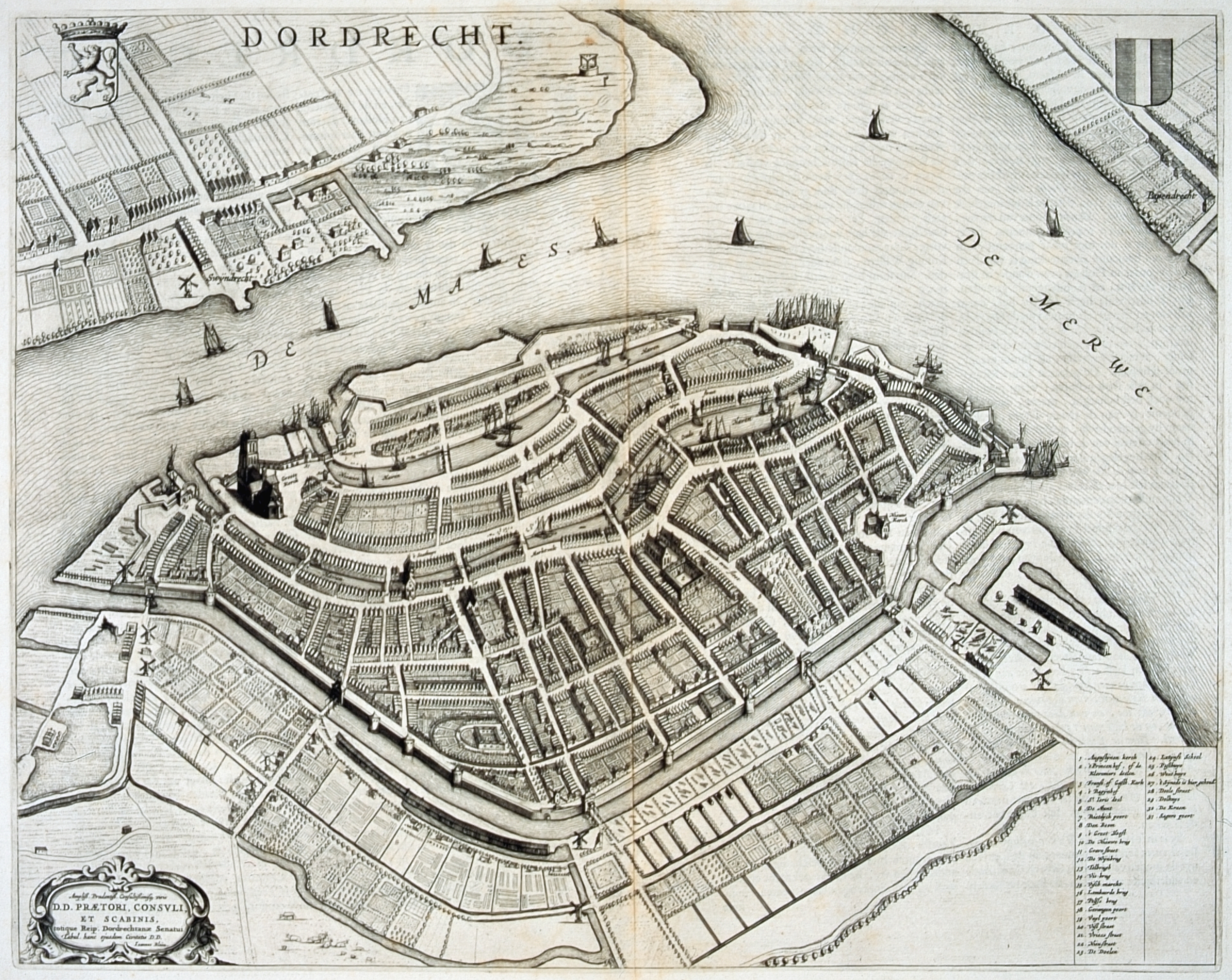 Plattegrond van Dordrecht, tussen 1640-1647 met bovenaan de wapens van Holland en …
