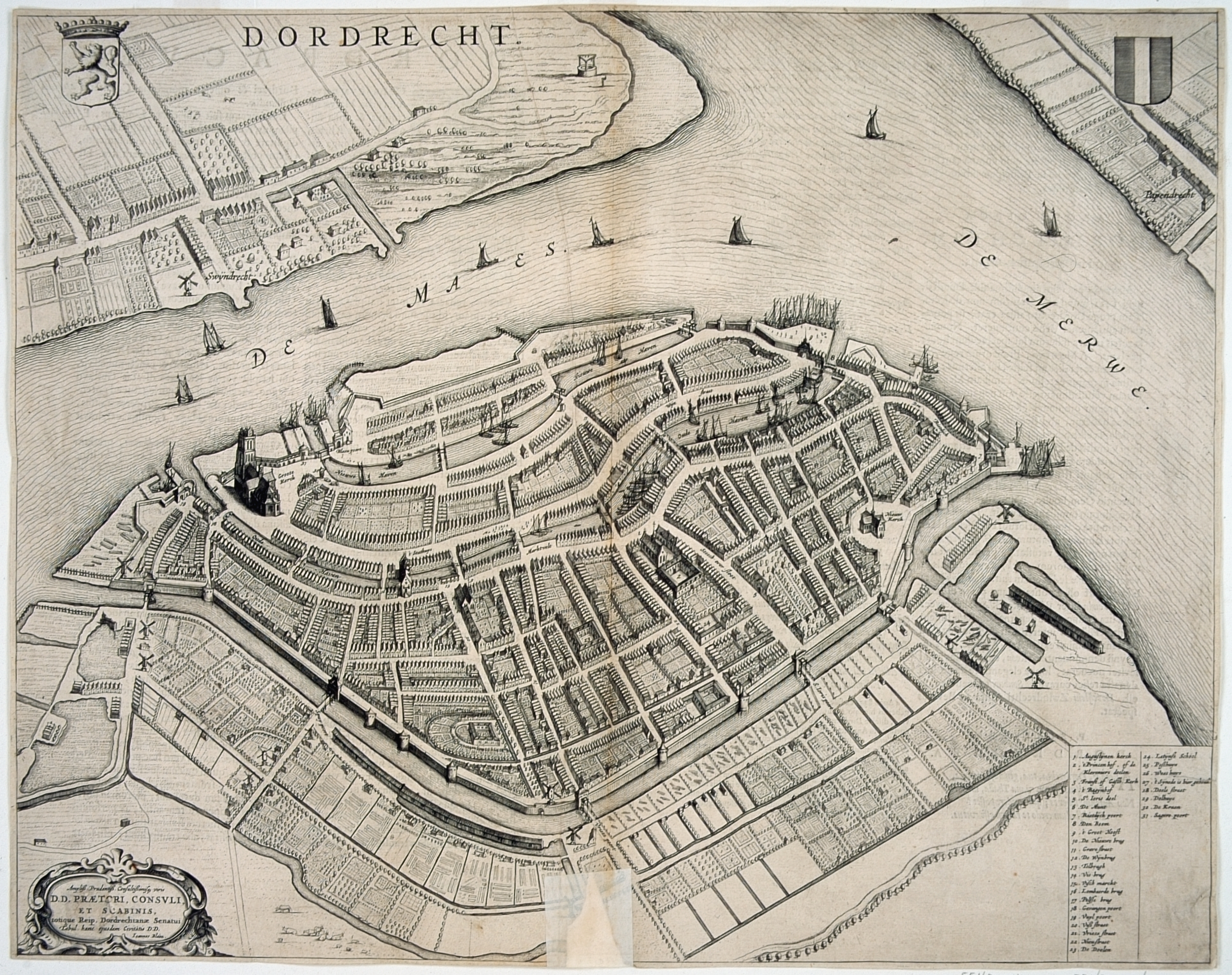 - Plattegrond van Dordrecht, tussen 1640-1647 met bovenaan de wapens van Holland en Dordrecht, links onderaan een cartouche met inschrift Ampliss. Prudentiss ... viris D. D. Praetori, Consuli et Scabinis totique Reip. Dordrechtanae Senatui Tabulam hanc ... D. D. Joannes Blaeu en rechts de verklaring der cijfers 1-31; van achter bedrukt in twee kolommen met Latijnse beschrijving der stad, overeenkomende met de beschrijving op de plattegronden van Braun en Hogenberg en een Latijns gedicht van P. Scriverius.
