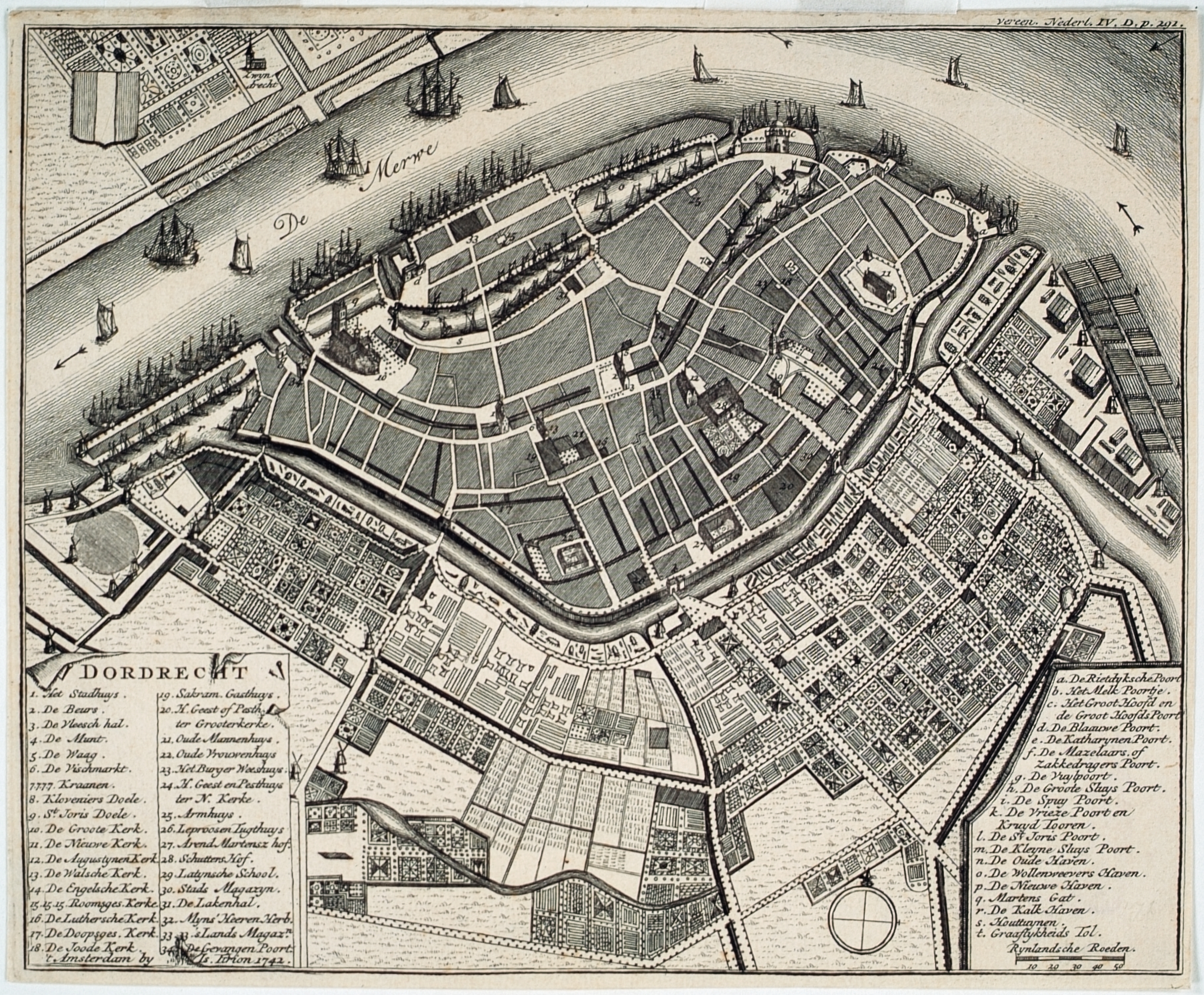Plan van Dordrecht ca. 1742. Kaart met inschrift: Dordrecht en verklaring der cijfers …
