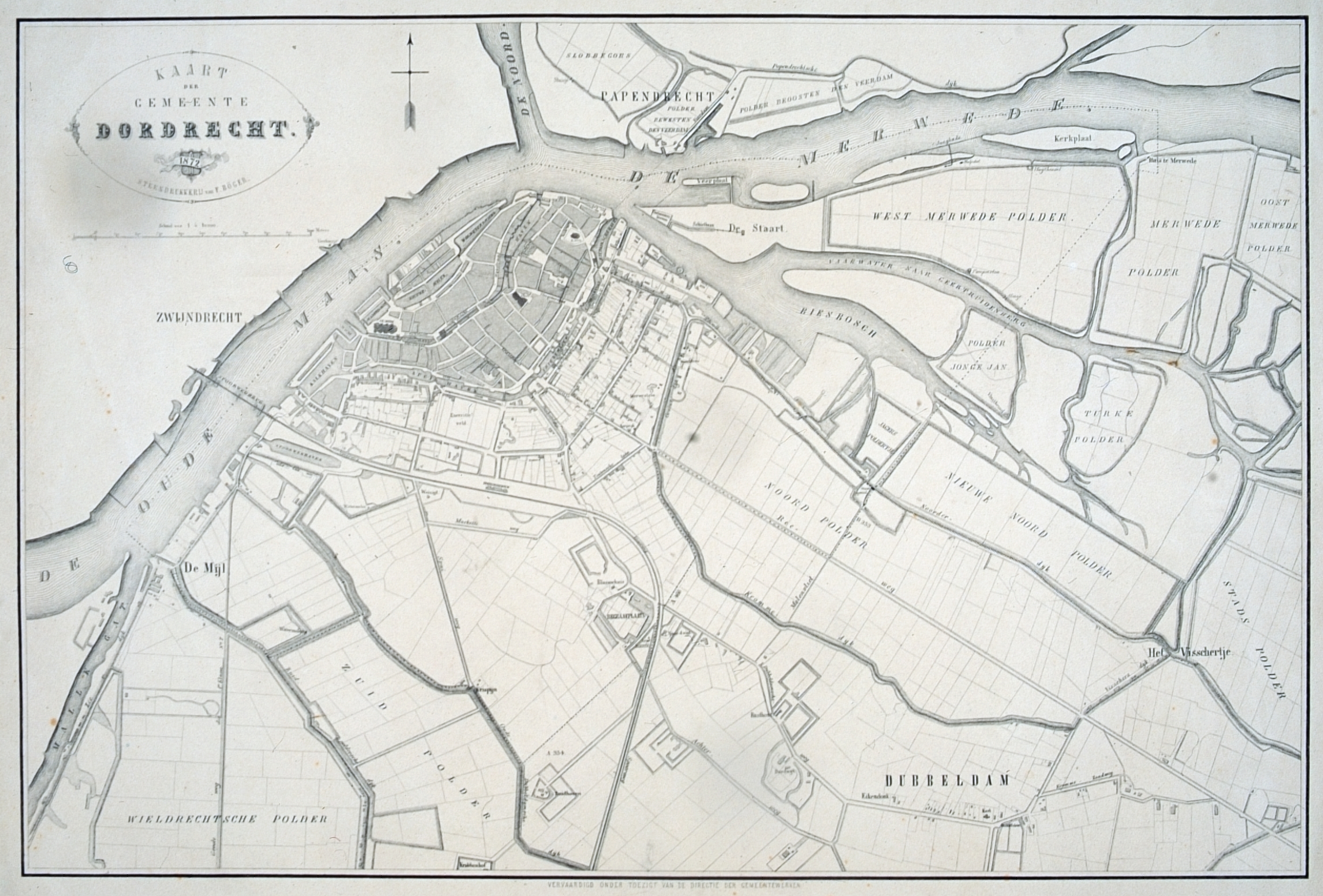 - Plattegrond van de stad Dordrecht en een deel van het Eiland van Dordrecht en de gemeente Dubbeldam in 1872, vervaardigd onder toezicht van de Directie der Gemeentewerken.