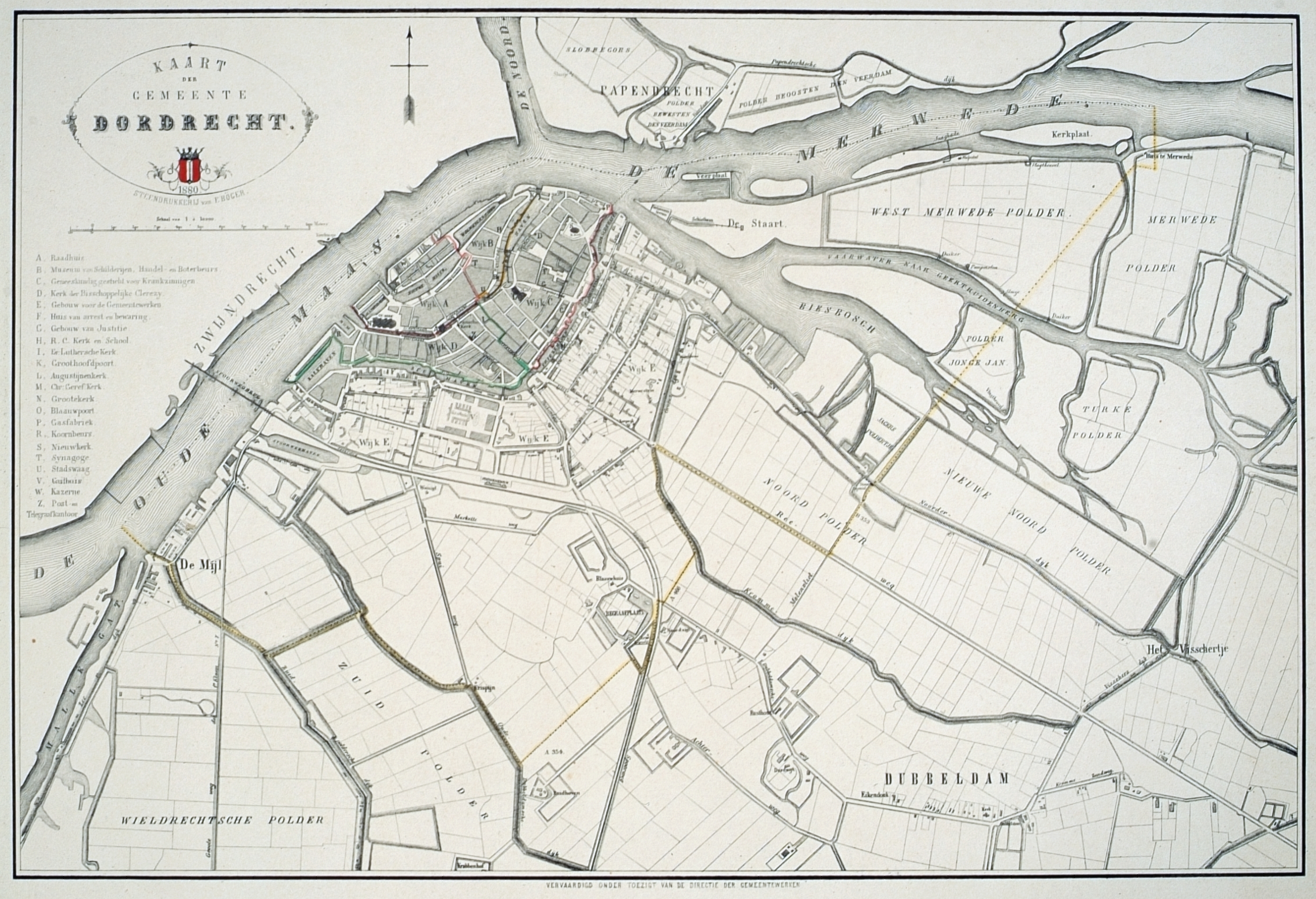 - Kaart van de Gemeente Dordrecht met gekleurd stadswapen en jaartal 1880, vervaardigd onder toezicht van de Directie der Gemeentewerken.