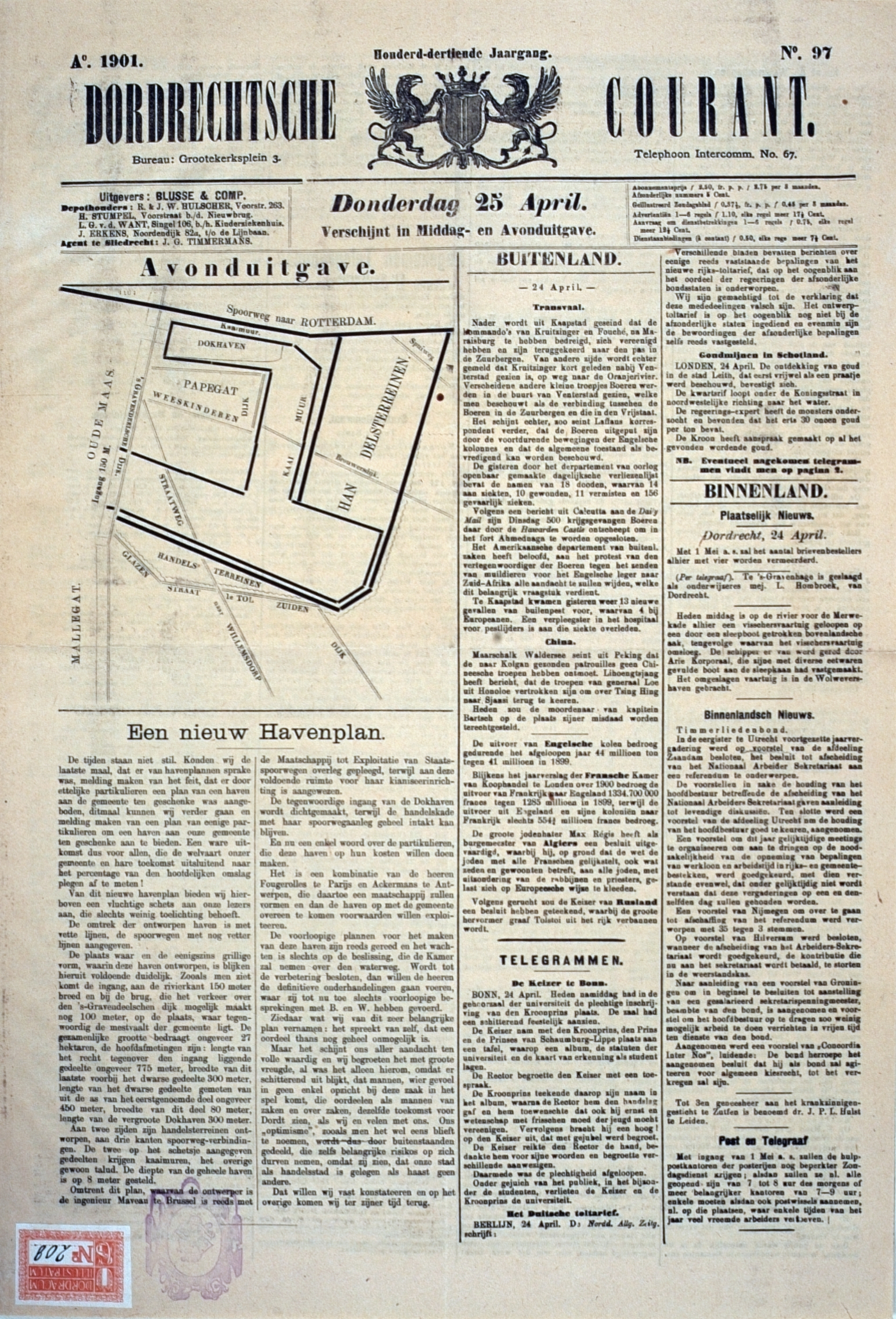 - hxb: 16 x 15 cm. Uit: Dordrechtsche Courant van donderdag 25 april 1901; dit plan, ontworpen door ingenieur Maveau te Brussel, beoogde het graven van een haven en het aanleggen van handelsterreinen tussen het bestaande spoorwegbassin en het als Glazenstraat bekend staande deel van de Zuidendijk.