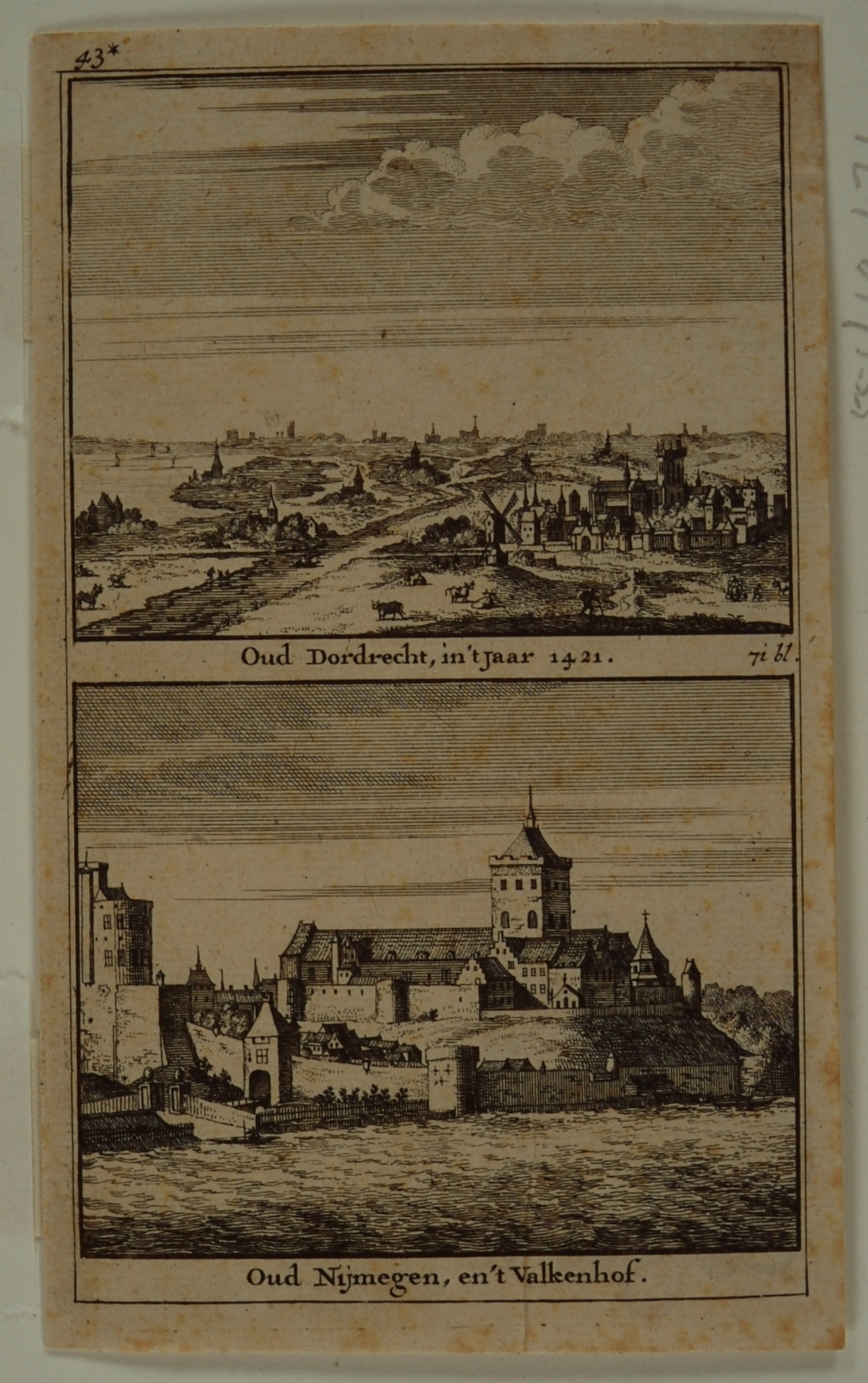 - Gefingeerde voorstelling van Dordrecht in 1421. Daaronder Oud-Nijmegen met het Valkenhof
