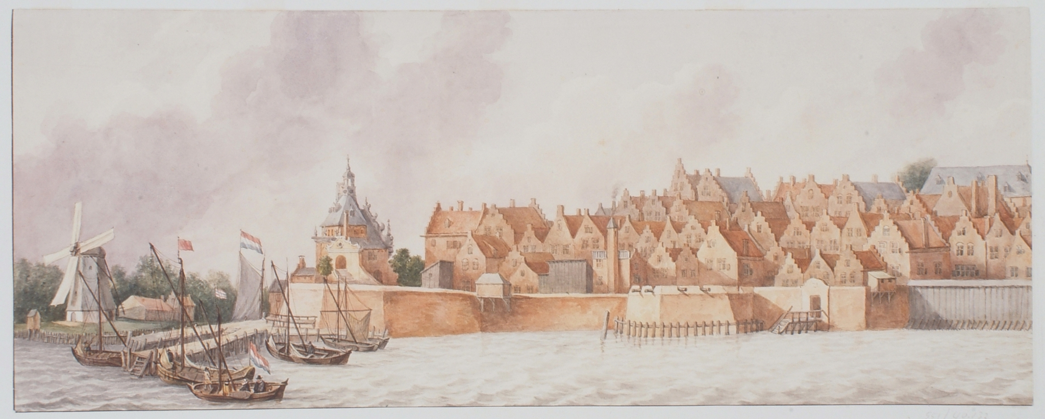 - Kopie van het Gezicht op Dordrecht van Adam Willaerts in het Dordrechts Museum doch zonder de op de rivier varende schepen, in vier aaneenpassende tekeningen in kleuren, te zamen breed 267.8 c; dit is deel 1.