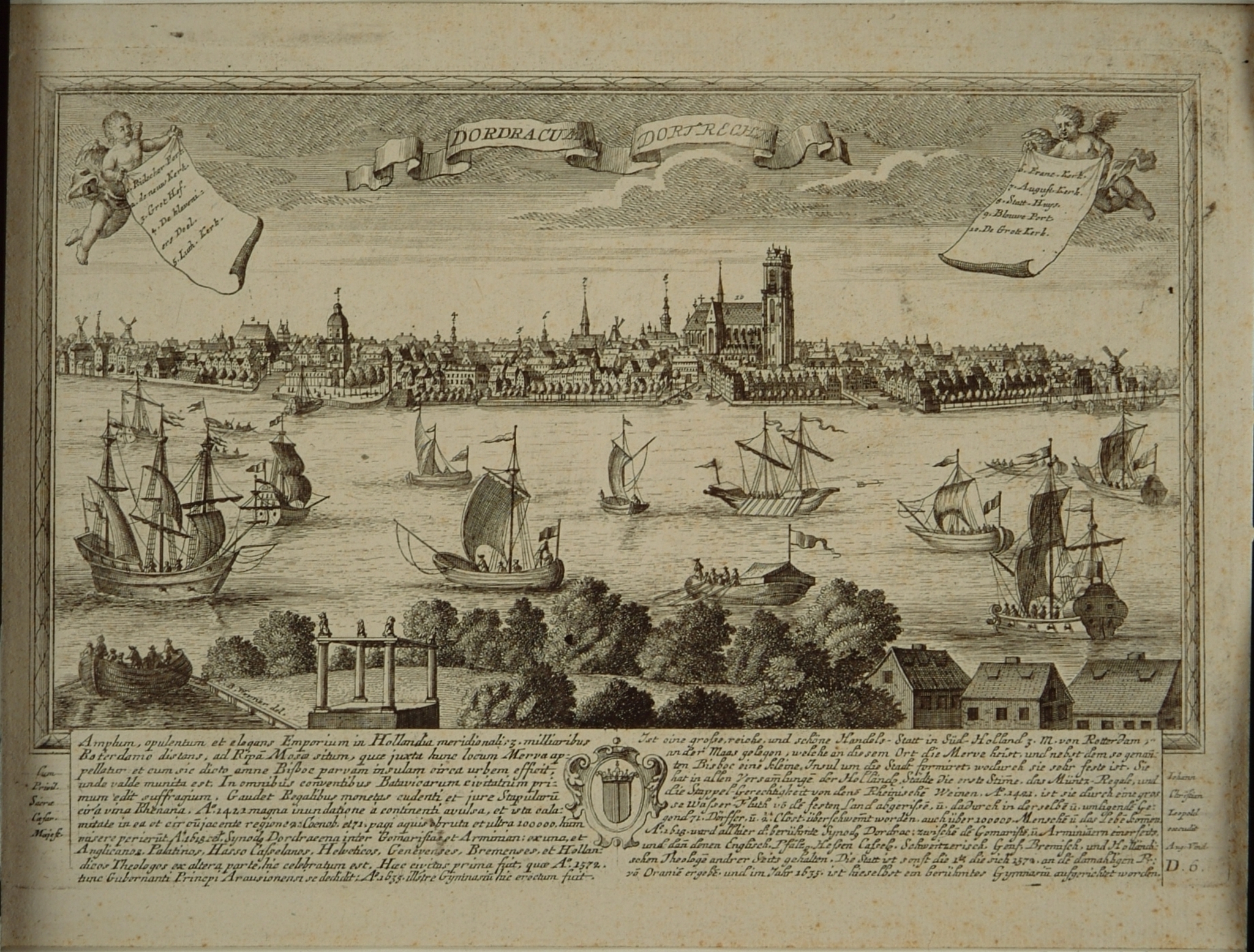 Gezicht op Dordrecht vanuit de Noord gezien, omstreeks 1736. Links op de voorgrond het gerecht