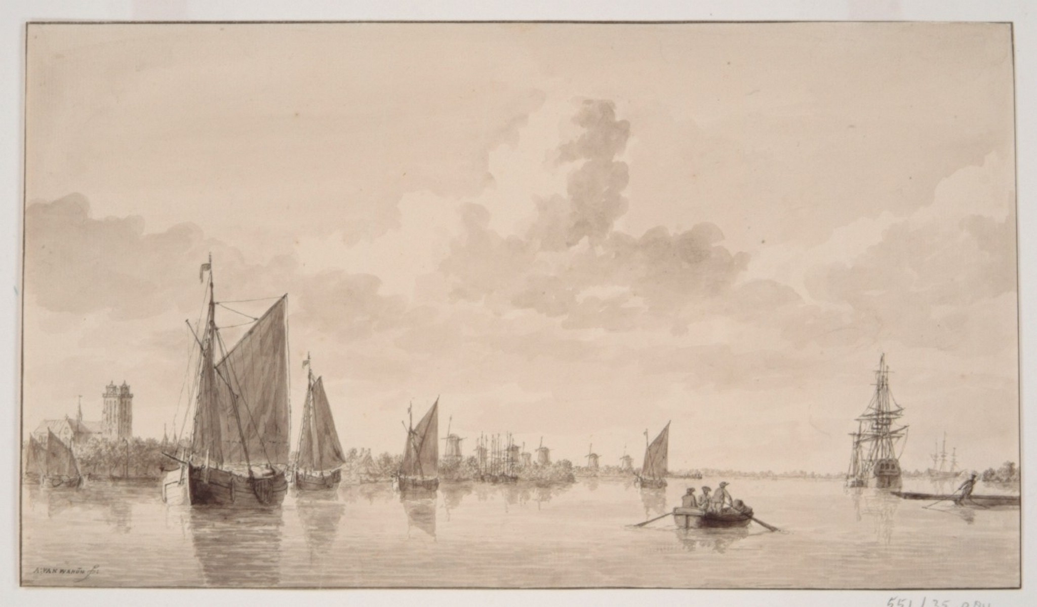 - Oude Maas ter hoogte van de Blauwpoort, links de Grote Kerk, anno 1771