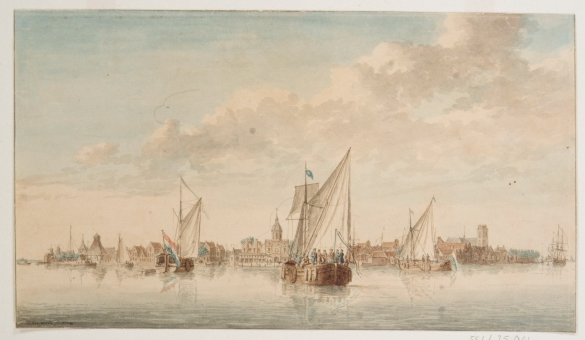 - Dordrecht van Buiten Walevest tot Riedijkspoort, anno 1774. Midden op de rivier een beurtschip, waarschijnlijk de Rotterdams-Dordtse marktschuit Het Varken.