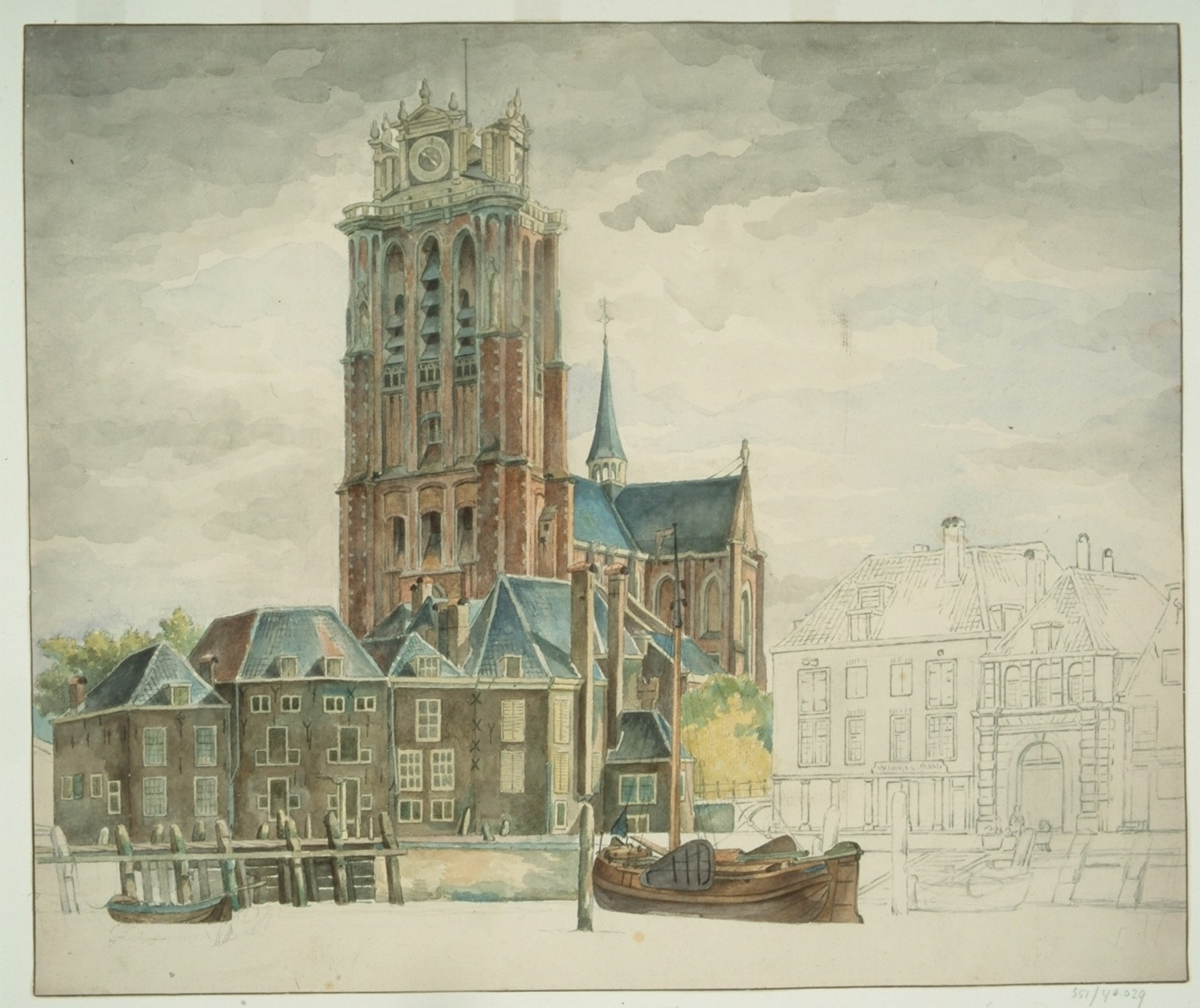 - Gezicht van de Bomkade op het hoofd in de Bomhaven, de Korte Geldersekade, Grote Kerk en Bomkade met Nieuwe Vuilpoort en oude korenbeurs.