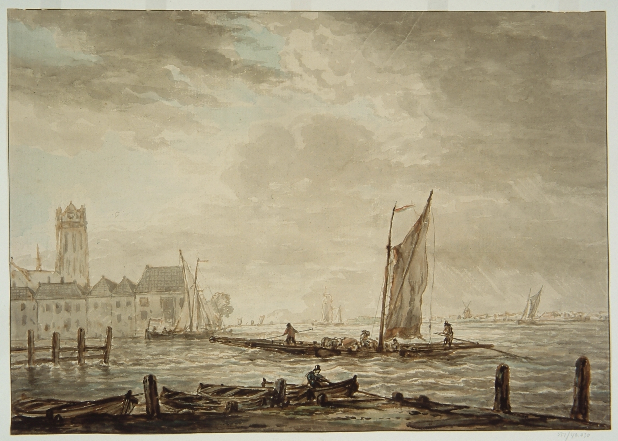 - Gezicht van de Buiten Walevest op de Grote Kerk en de achterkant der huizen aan de Korte Engelenburgerkade met op de voorgrond de veerpont op Zwijndrecht..