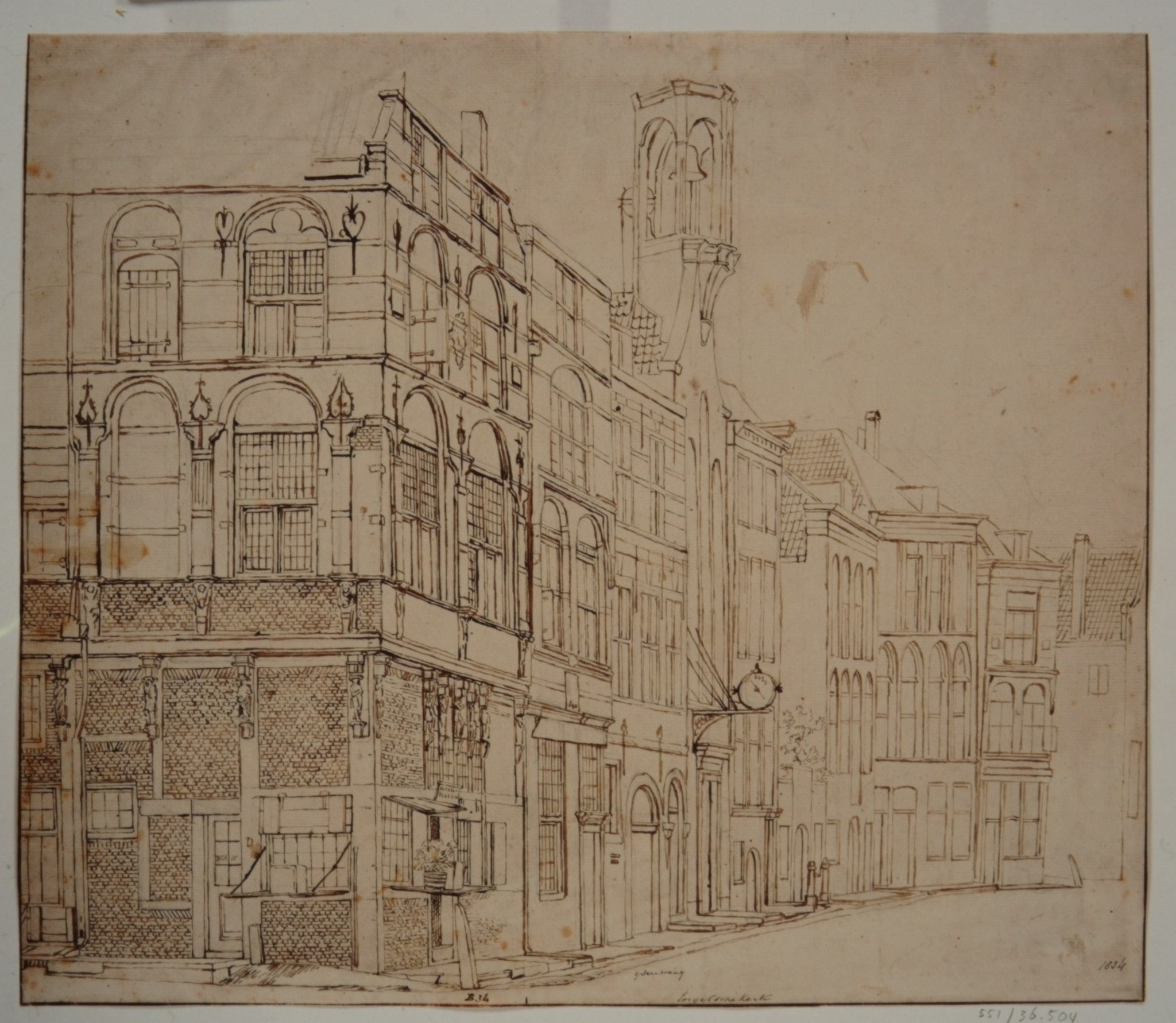 - hxb: 40 x 45,3 cm. Van deze panden zijn er vijf (B 21-17) gesloopt in 1841 en vervangen door het gebouw van de Boterbeurs, waarin van 1842-1904 het Dordrechts Museum was gevestigd. Daarna werd het tot Openbaar Leesmuseum ingericht. Het hoekhuis links op deze tekening (de Kroon van Denemarken) stond niet hier, maar op de Z.-W.hoek van de Nieuwbrug. Zie nr. DI 514