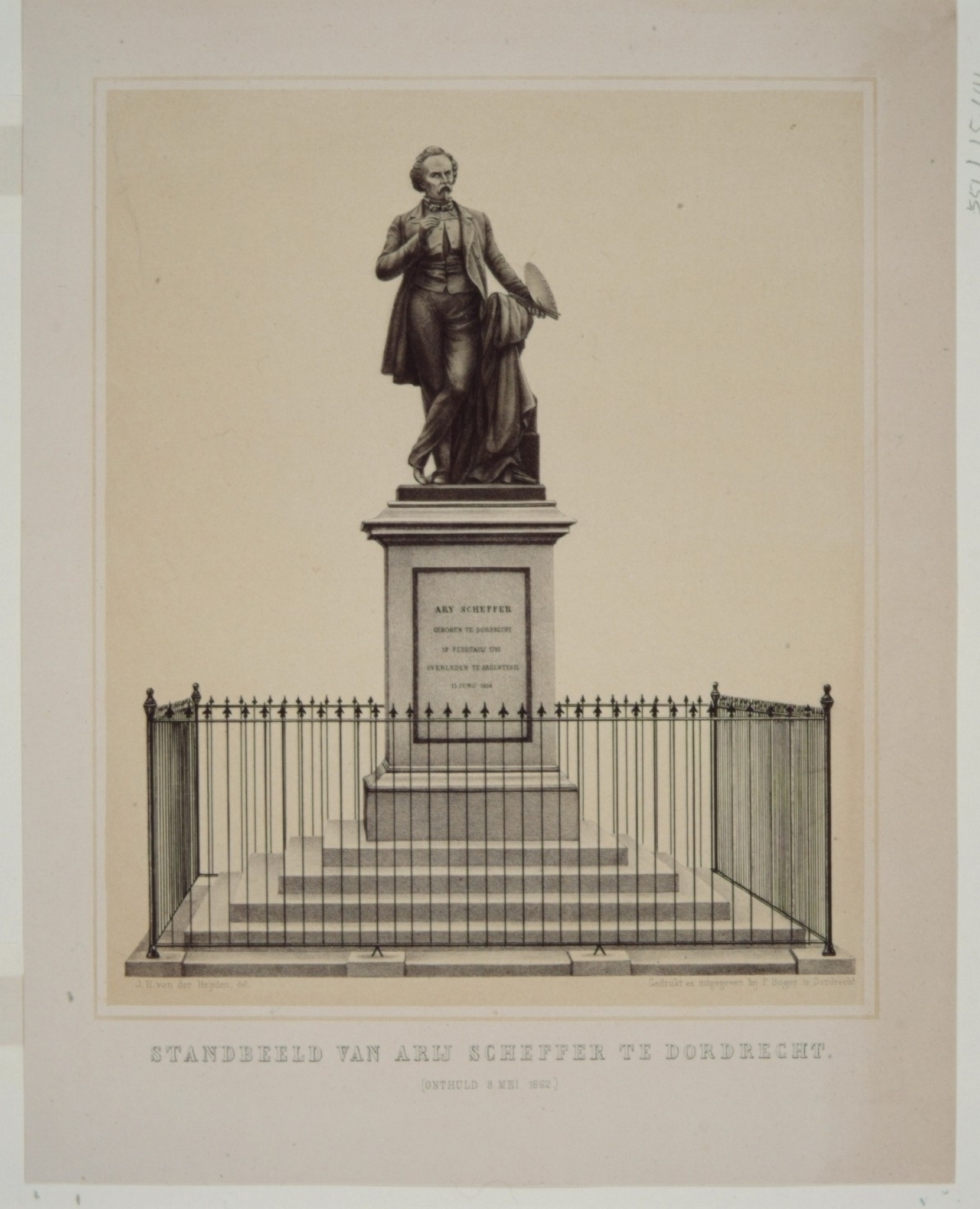 - Het standbeeld van Ary Scheffer op het naar hem genoemde Scheffersplein. 1862. Standbeeld van Ary Scheffer te Dordrecht