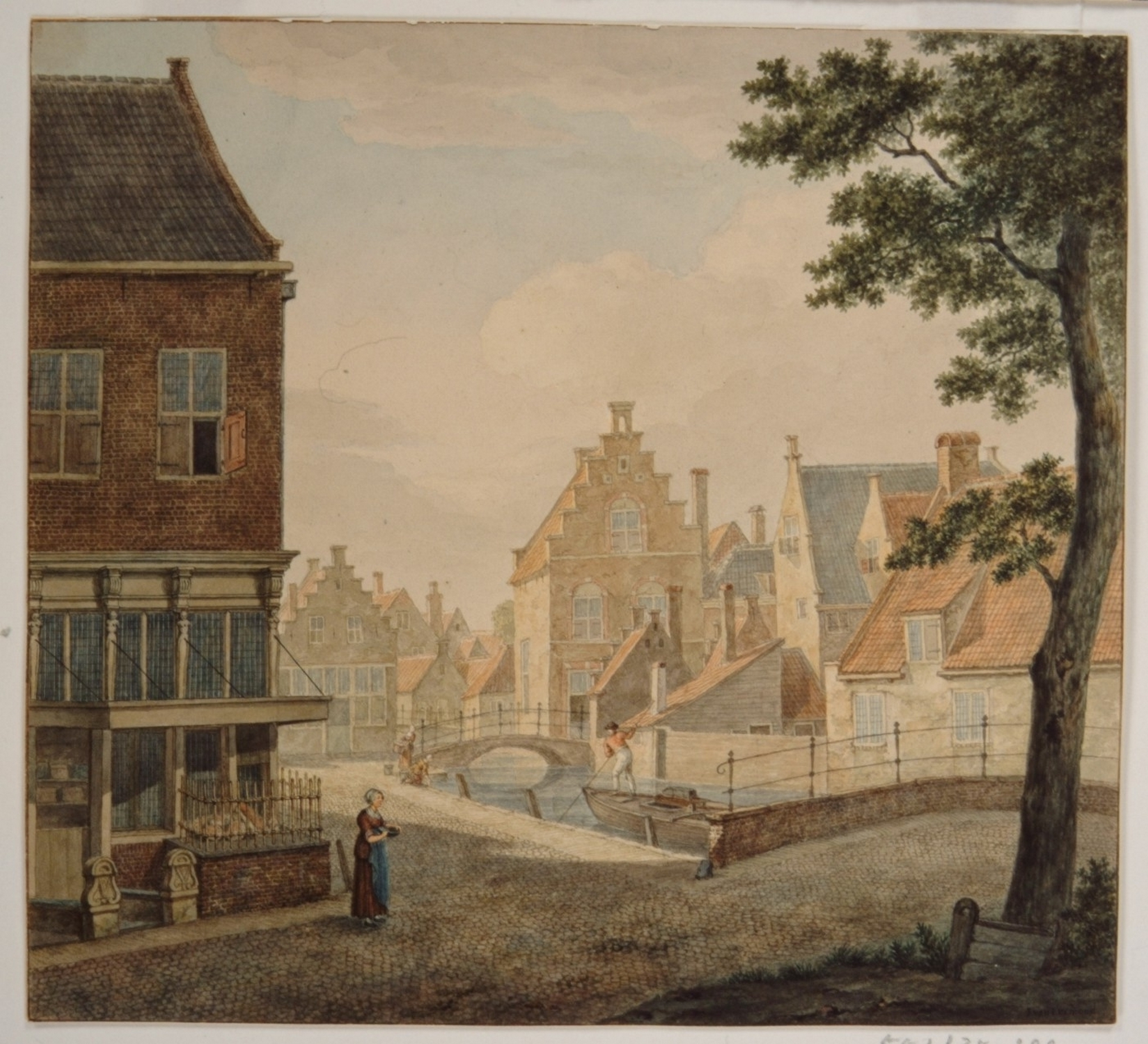 - Lindengracht met bruggen voor Nieuwstraat en Kolfstraat. Het huis links stond niet hier, maar op de hoek Lindengracht/Steegoversloot, omstreeks 1830