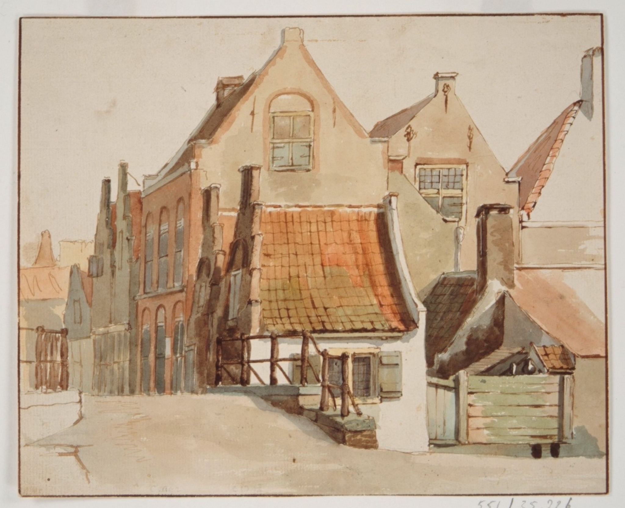 - Kolfstraat over de Kolfstraatsbrug met rechts het huis de Kalandermolen, een huis voor bedelaarsgezinnen, omstreeks 1835