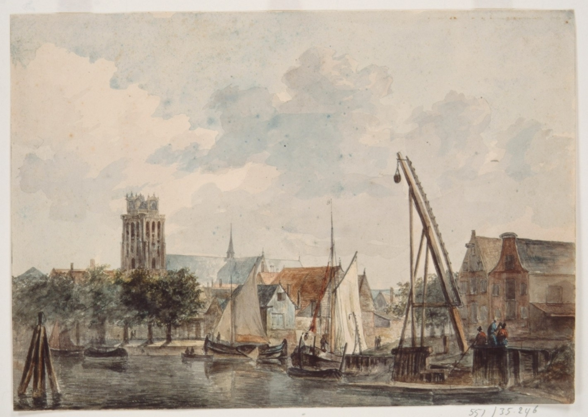 - Kalkhaven met rechts het Achterhakkers en kielpaal, omstreeks 1840
