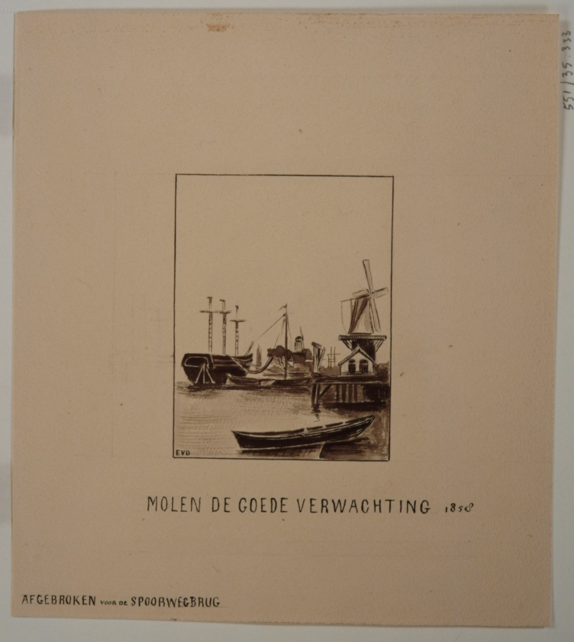 - hxb: 10,3 x 8 cm. Deze houtzaagmolen -de laatste windmolen die in Dordrecht werd gebouwd (in 1858)-, werd reeds rond 1865 gesloopt om plaats te maken voor het landhoofd van de Spoorbrug.