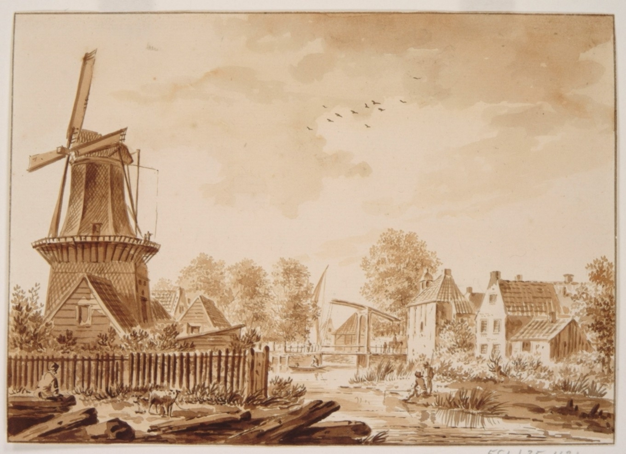 - Minnebrôers- of Kruittoren, gezien vanuit het Lange Kromhout, met molen De Arend op de voorgrond, omstreeks 1768.