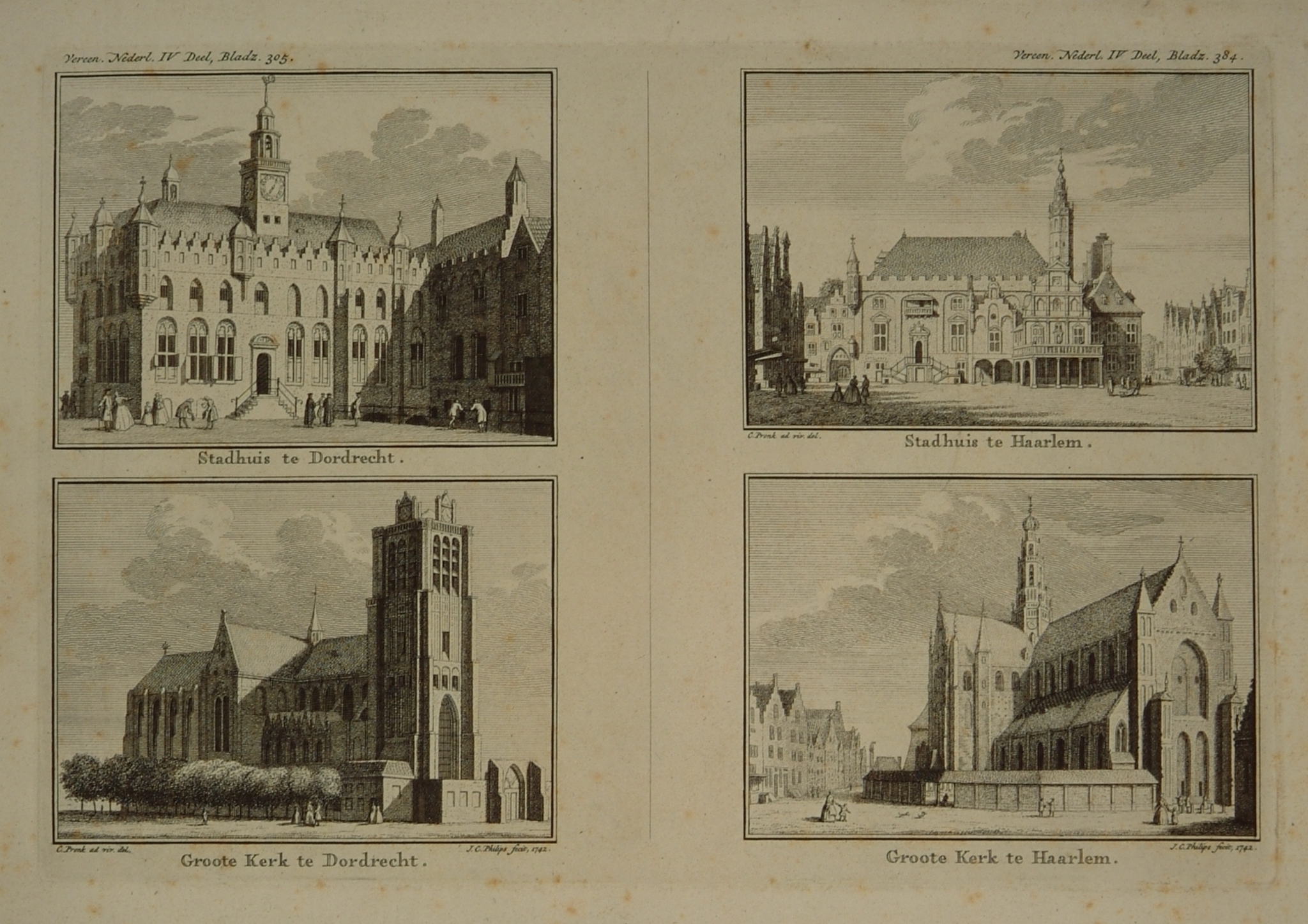 Vier afbeeldingen met de stadhuizen van Dordrecht en Haarlem, alsmede de Grote Kerk van …