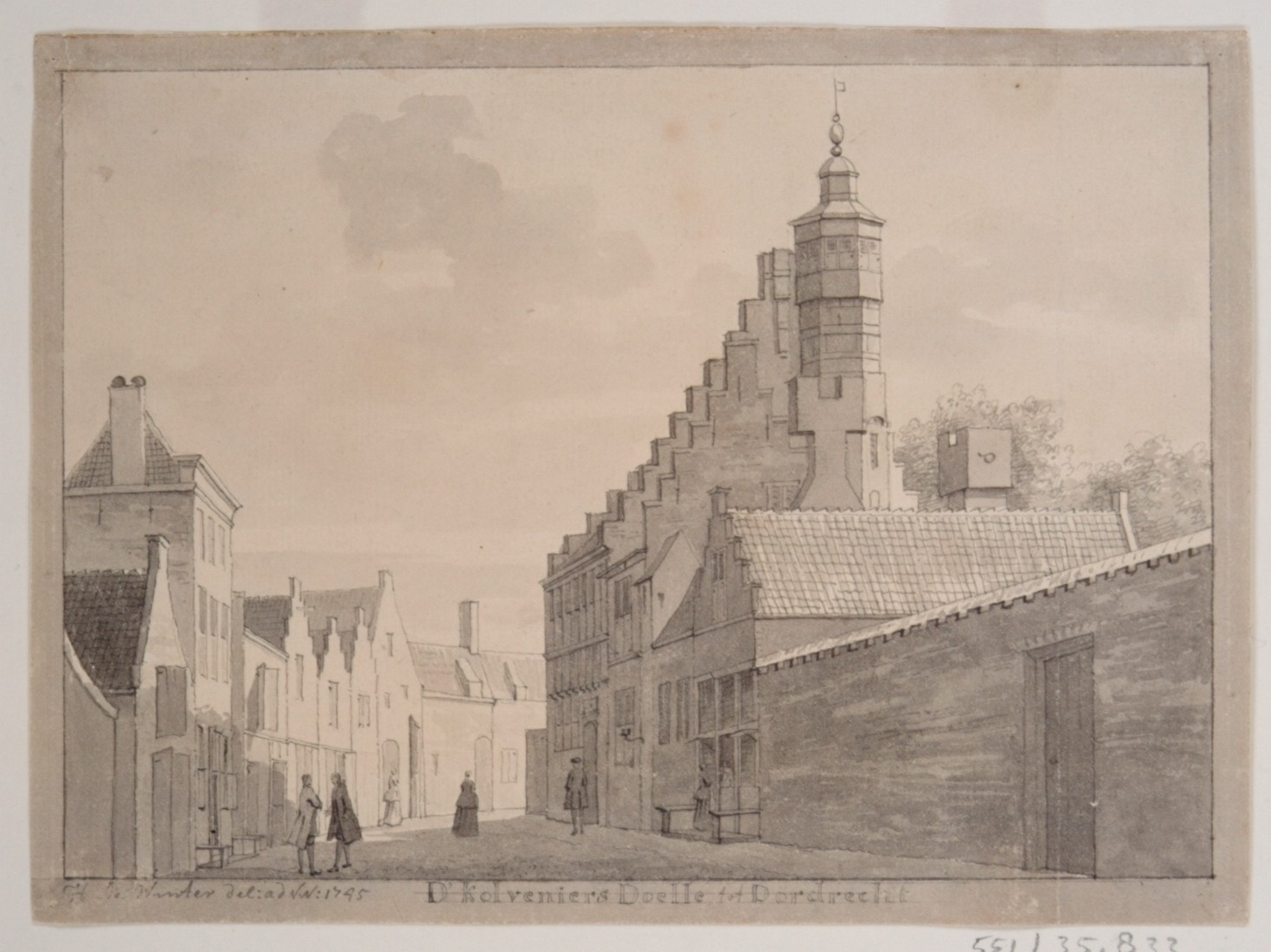 Kloveniersdoelen, anno 1745, gezien vanuit Doelstraat