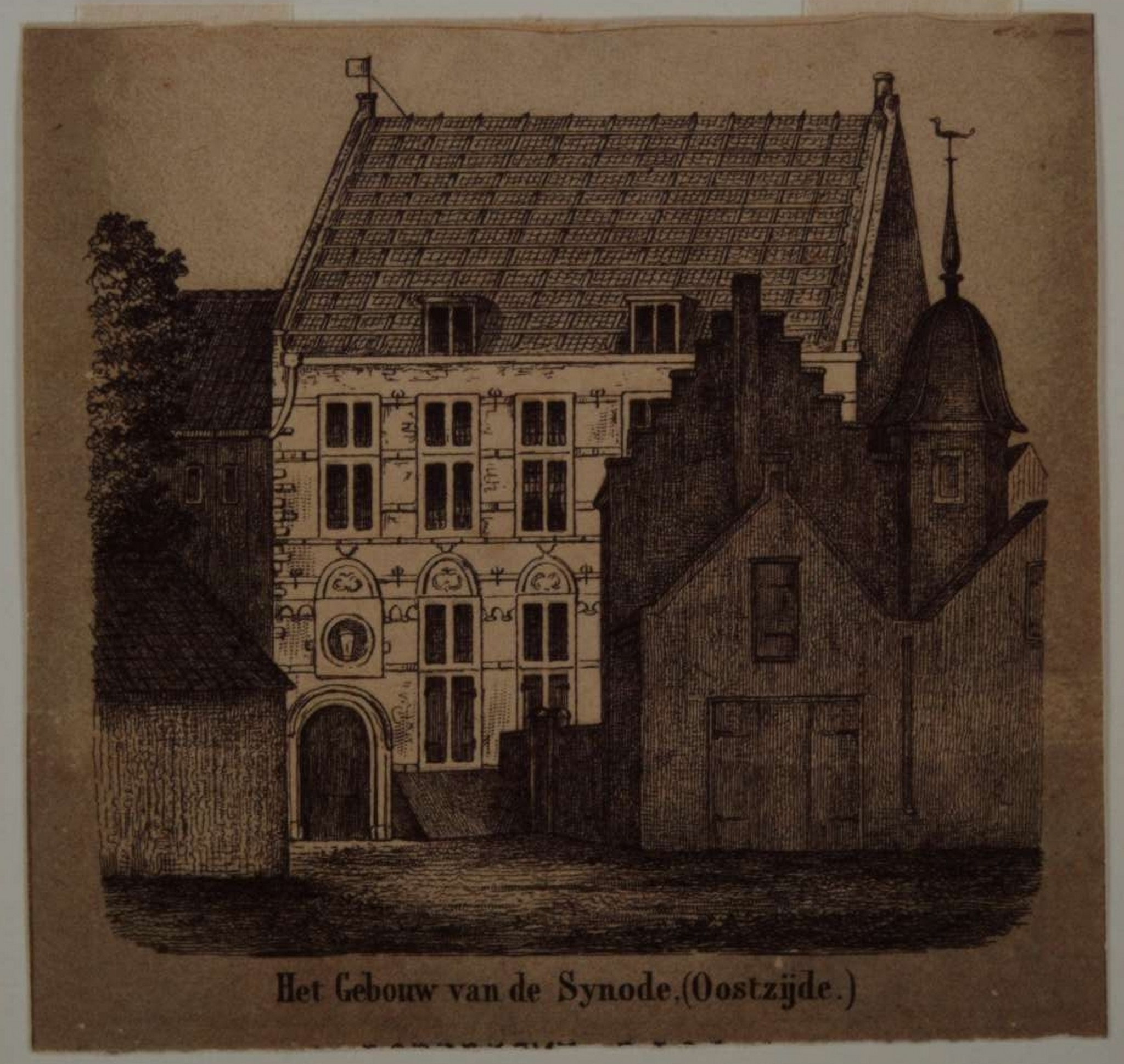 - Kloveniersdoelen, ca. 1850. Het gebouw van de Synode (oostzijde) met Schiethuis