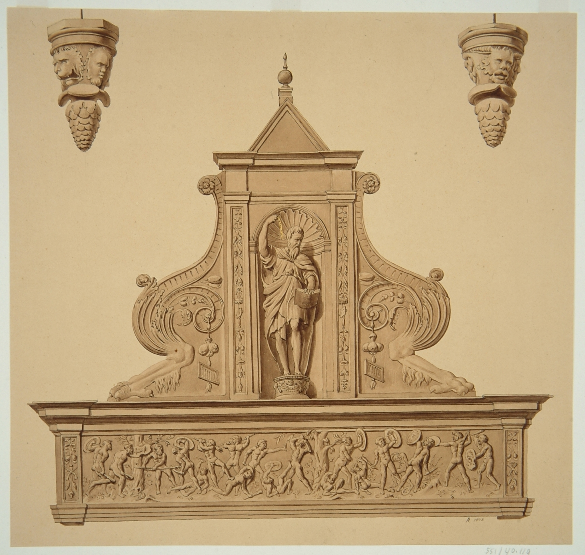 Afbeelding van de gebeeldhouwde schoorsteenkap uit 1535 uit de benedenzaal en druipers …