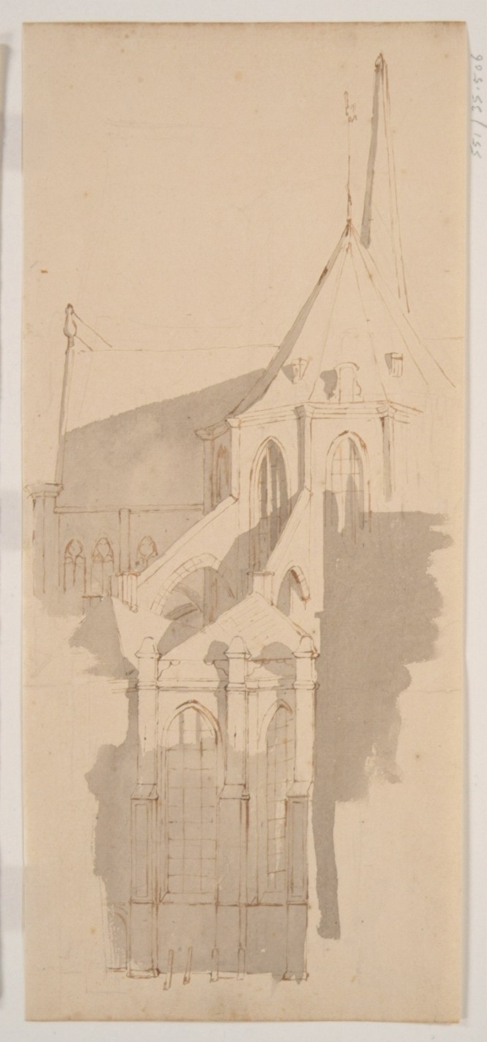 Vanaf Grotekerksplein... aanvankelijk dacht ik dat dat onmogelijk is vanwege de bebouwing rechts en je van daar vrij zicht op de kerk hebt. Maar het kan ook zijn dat we geen bebouwing zien, maar de schaduw van bebouwing. Het zonlicht komt van rechts, dus kan het zijn dat we wel vrij naar de kerk kijken, maar hier tegen een schaduw van andere bebouwing van het Grotekerksplein aankijken. Er zijn geen verdere details van de kerk in de schaduw te zien. Mogelijk is de tekening niet helemaal afgemaakt, zie ook het witte vlak links.