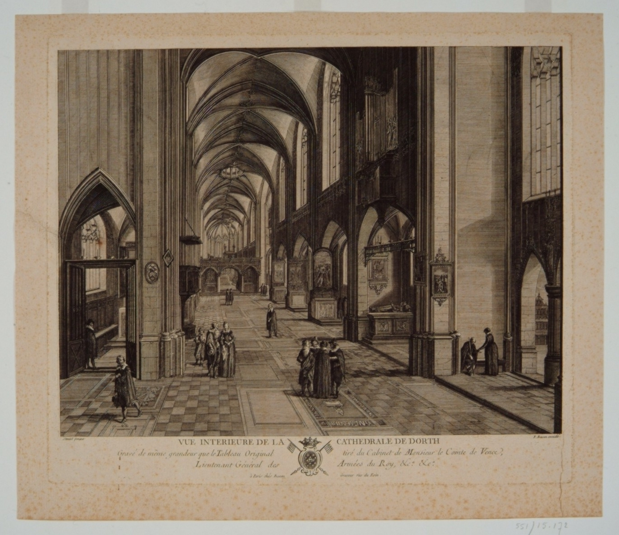 - Gezicht in een Gothische kerk met figuren uit het eerste kwart der zeventiende eeuw; rechts kapellen met altaren en de tombe van een bisschop, links de preekstoel; volgens opschrift 'Vue intérieure de la Cathédrale de Dordt' doch heeft in werkelijkheid niets met de Grote Kerk te maken.