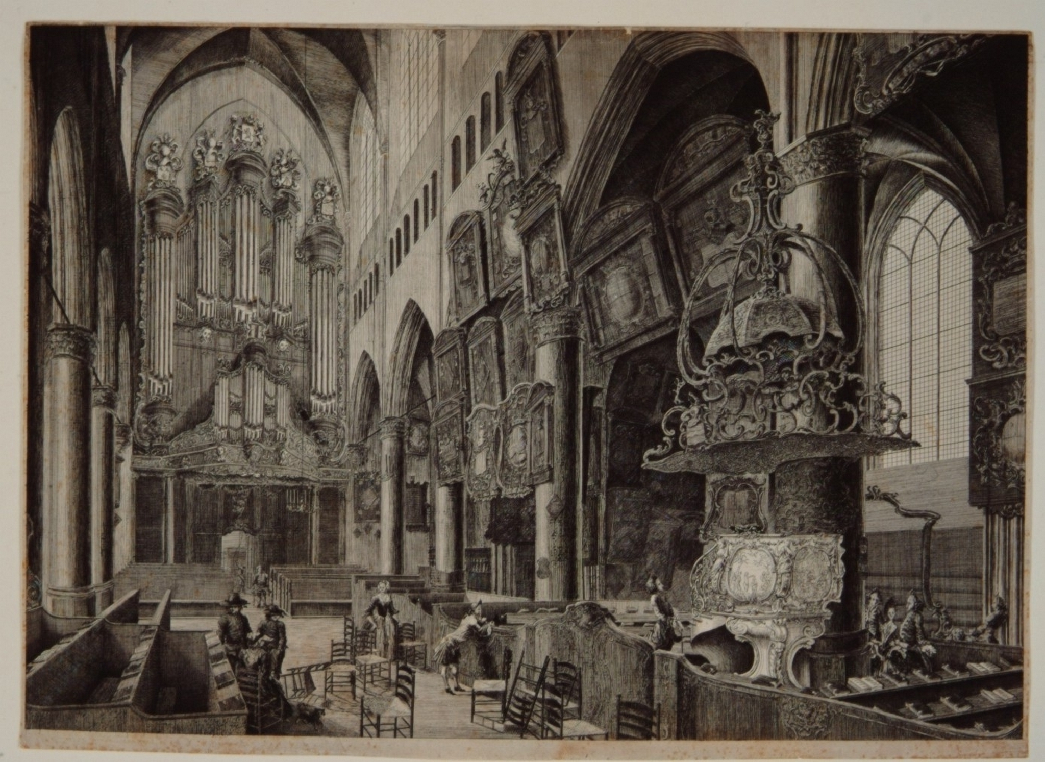 - Geromantiseerd gezicht op het middenschip van de Grote Kerk van koor naar orgel met op de voorgrond de marmeren preekstoel.