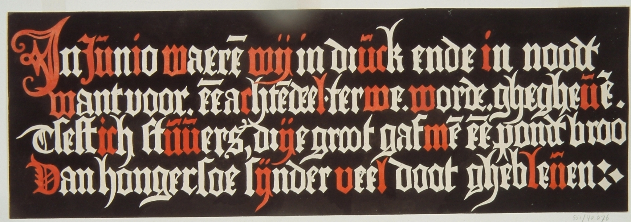 - Afschrift van een tijdvers in Gotische letter, in de Grote Kerk aangebracht tegen de achterkant van de koorbanken tussen de eerste en tweede pilaar in de noorder kooromgang, ter herinnering aan de hongersnood van 1557.