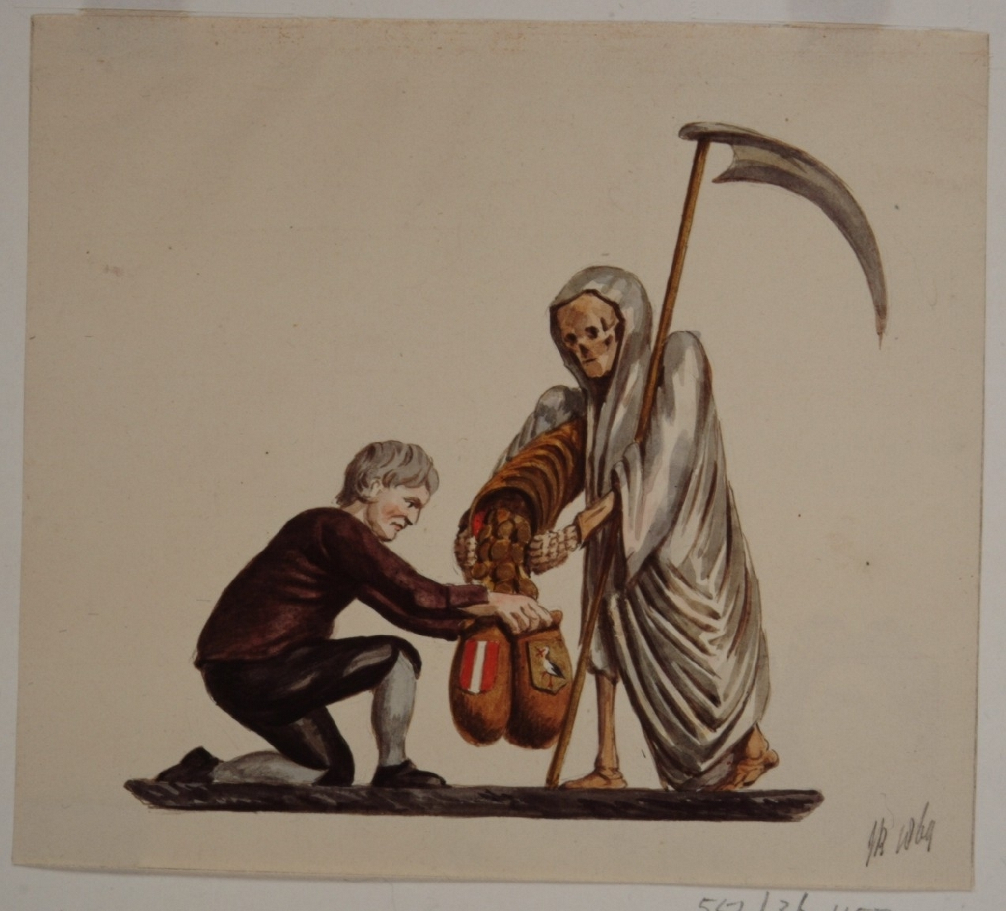 Grote Kerk; gedenkteken - legaat de Bertry. Midden 18e eeuw. Gebeeldhouwde, polychrome groep, vroeger aanwezig aan een der pilaren, aan de Zuid-zijde van het Grote koor, ter herinnering aan het legaat van Hendrik Ernst de Bertry en zijn Weduwe aan de Diaconiën van Dordt en Den Haag, voorstellende: de Dood die een hoorn vol geldstukken uitstort in een buidel, met de wapens der voornoemde steden, vastgehouden door een grijsaard.