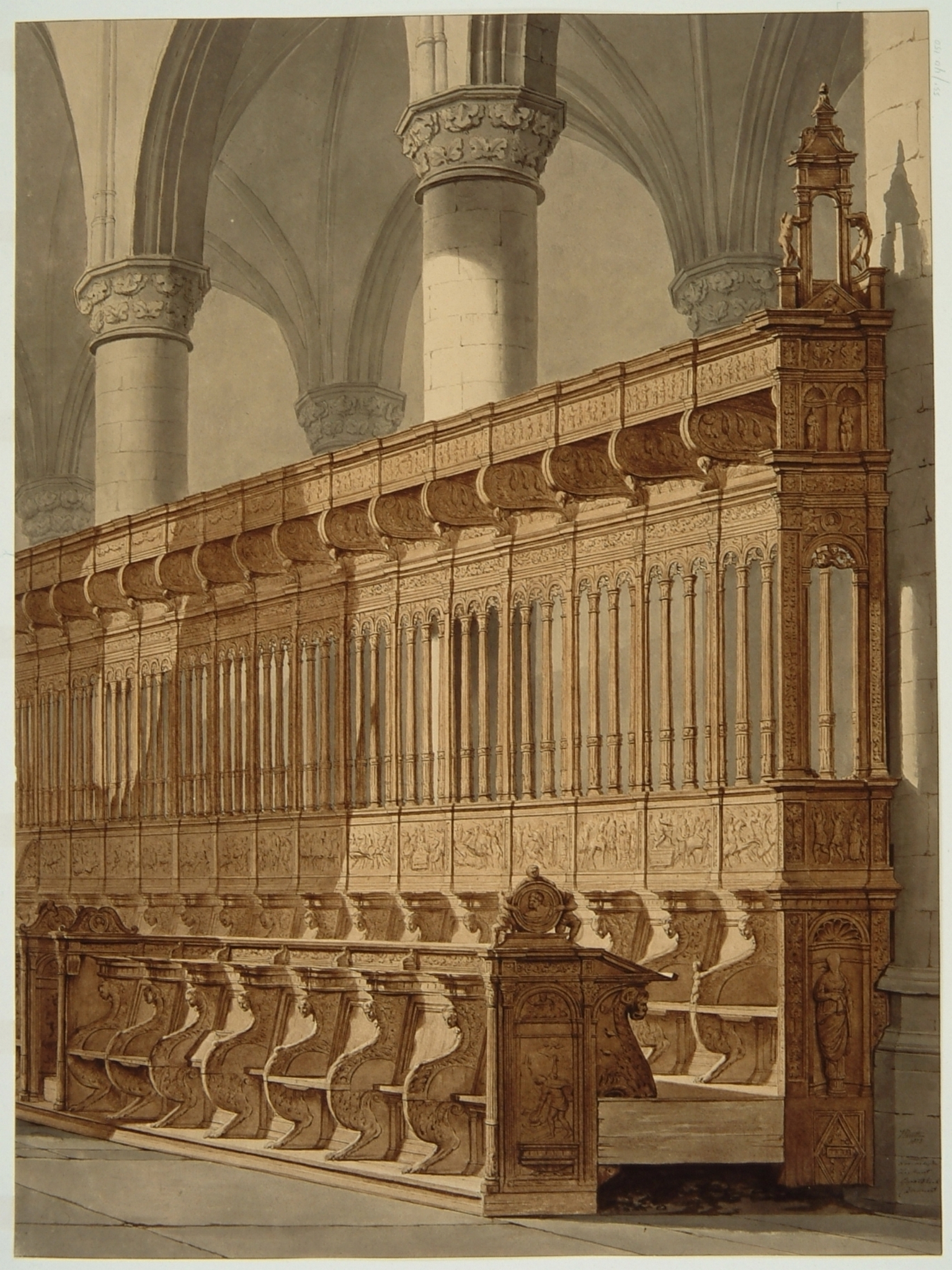 De noordzijde van de koorbanken in de Grote Kerk, gezien vanuit het oxaal.