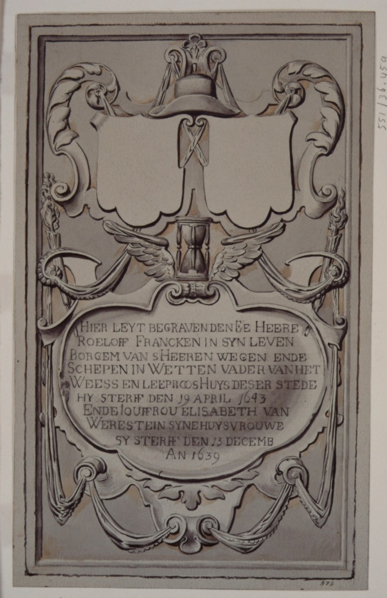 - Grote Kerk; hardstenen zerk van Francken-Weresteijn: de wapens zijn weggehakt.