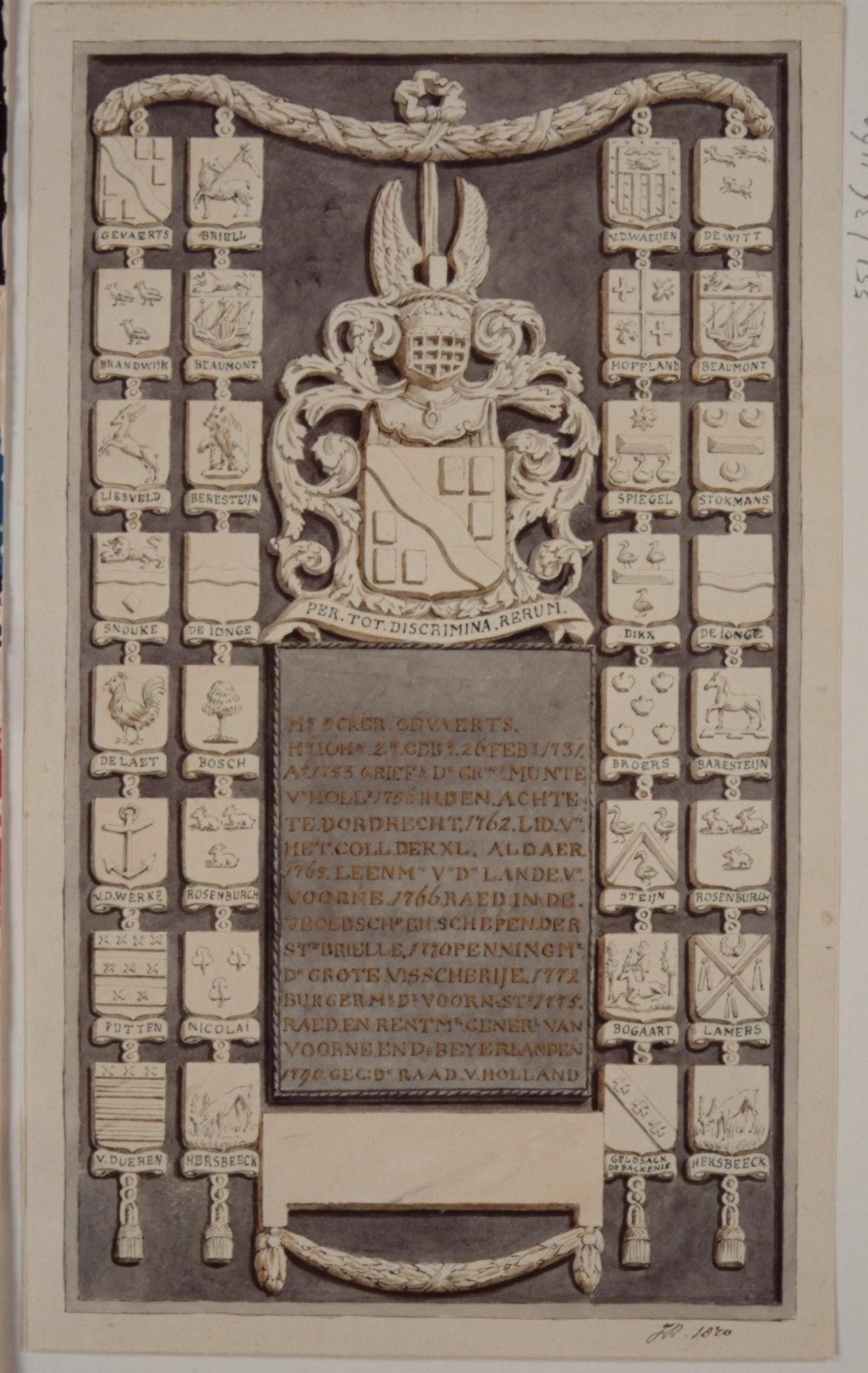 - Grote Kerk; hardstenen zerk van Gevaerts, met hoofdwapen en 32 kwartieren in wit marmer en opschrift in vergulde letters. De wapens zijn ongeschonden.