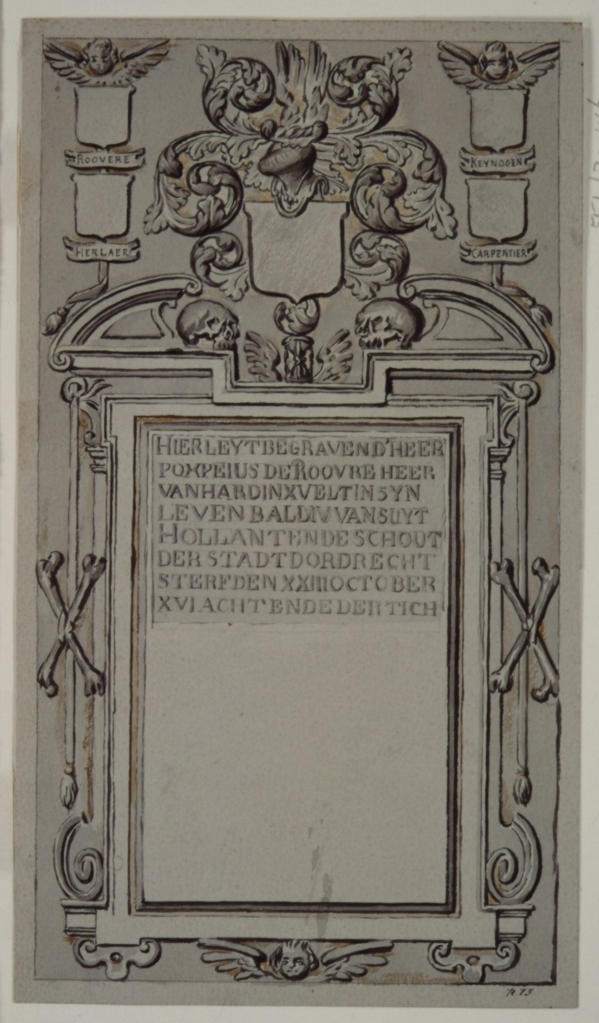 Grafsteen in de Grote Kerk van Pompejus de Roovere waarvan de wapens zijn weggehakt