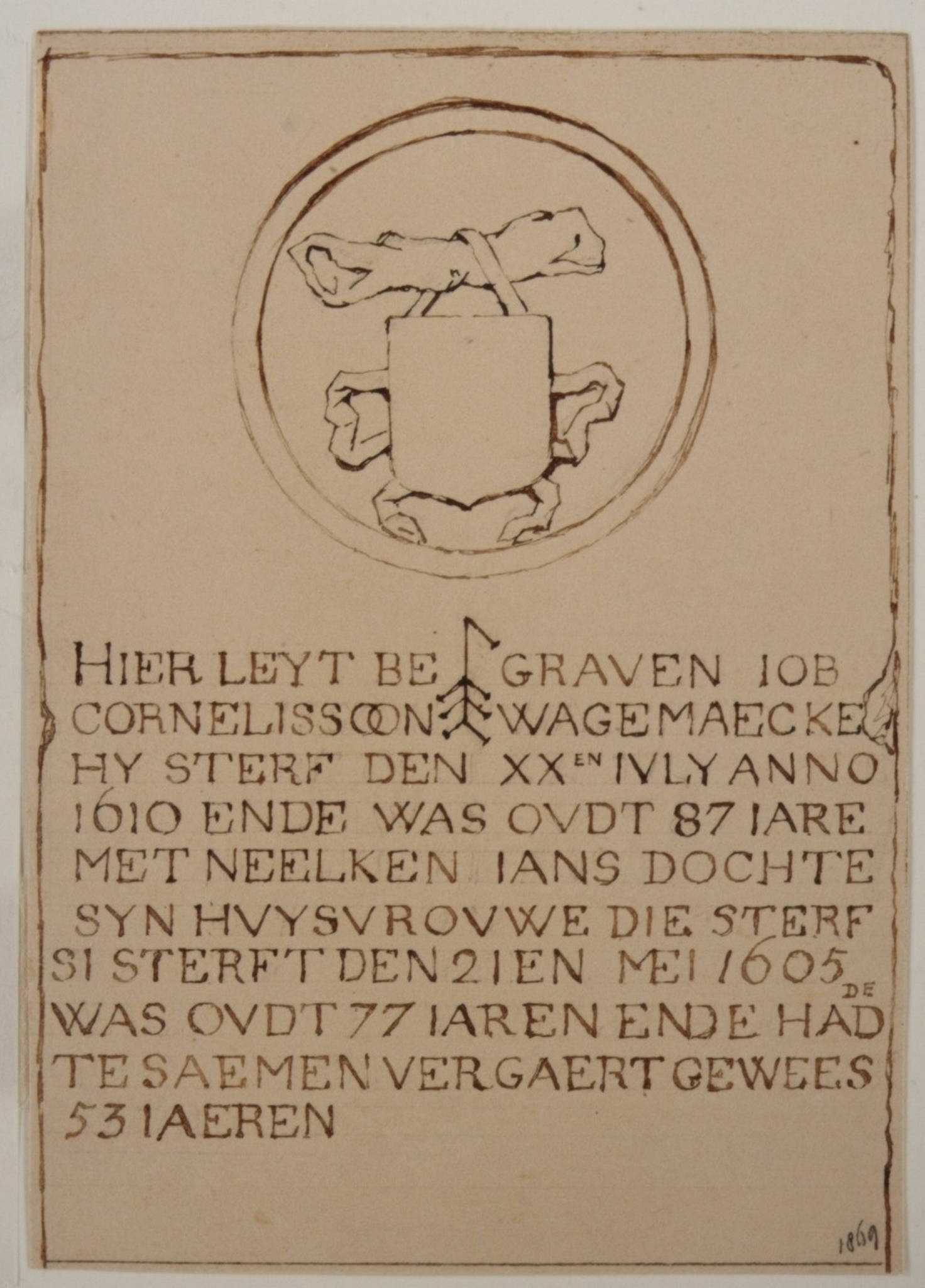 - Grafsteen in de Grote Kerk van Job Wagemaecker en Neelken Jansdr. waarvan de wapens zijn weggehakt