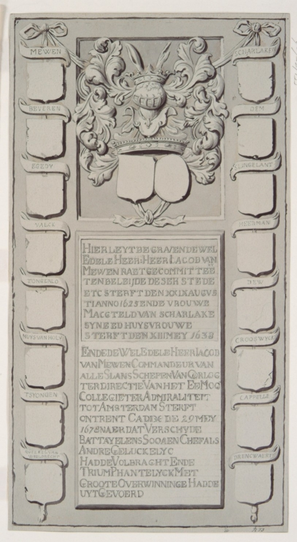 - De grafzerk van Jacob van Mewen en zijn vrouw Machteld van Scharlaken in de Grote Kerk hardstenen zerk . De wapens zijn weggehakt.