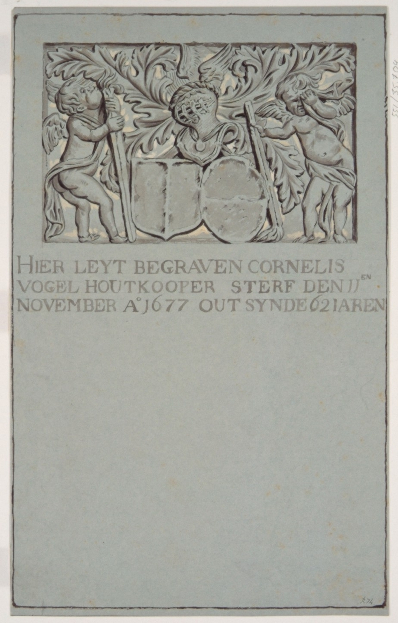 - Grote Kerk - hardstenen zerk van Vogel. De wapens zijn weggehakt.
