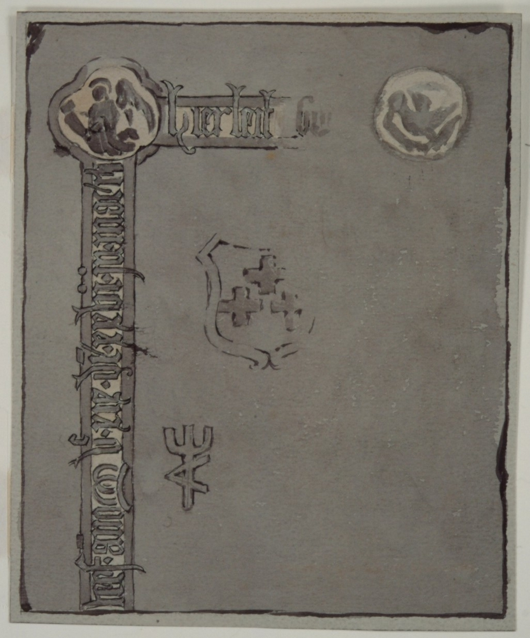- Fragment van een Gothische zerk met de afbeelding van een huismerk en een wapen met drie kruizen; in de bovenhoeken staan de symbolen van de evangelisten Matheus en Johannes.