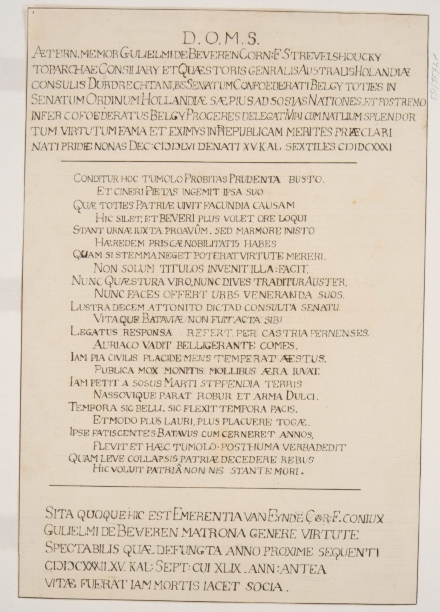 De tekst luidt: D.O.M.S. Aetern Memor de Guillemi de Beveren, Corn.F. Strevelshoucky Toparche, enz. (zie M.Balen)