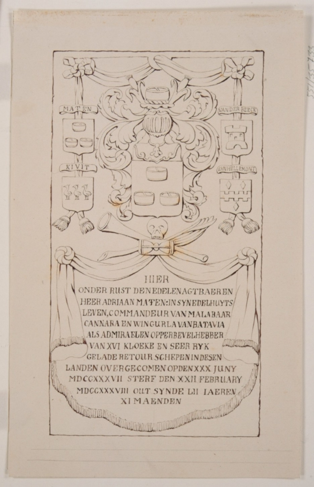Grote Kerk - Hardstenen grafzerk van Maten, anno 1728. met de volgende wapens en opschrift: HIER ONDER RUST DEN EDELEN AGTBAEREN HEER ADRIAAN MATEN: IN SYN EDELHUYTS LEVEN, COMMANDEUR VAN MALABAAR CANNARA EN WINGURLA VAN BATAVIA ALS ADMIRAEL EN OPPERBEVELHEBBER VAN XVII KLOEKE EN SEER RYK GELADE RETOURSCHEPEN IN DESEN LANDEN OVERGECOMEN OP DEN XXX JUNY MDCCXXXVII STERF DEN XXII FEBRUARY MDCCXXXVIII OUT SYNDE LII JAEREN XI MAENDEN.