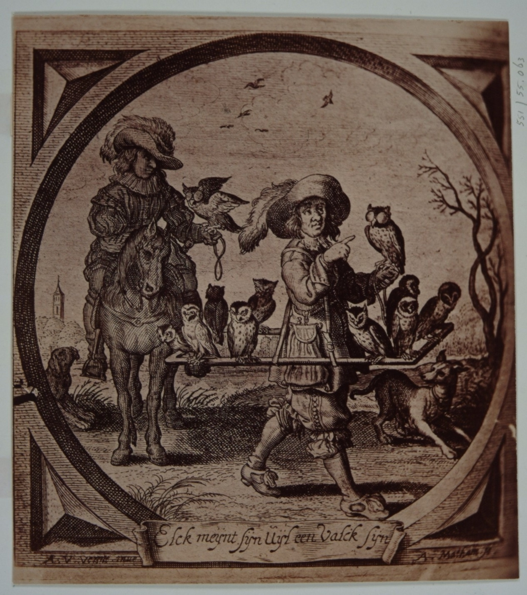 Nieuwe Haven 39, glasschildering: zinnebeeldige voorstelling van het spreekwoord 'Elck meynt sijn uyl een valck te sijn', zoals gepubliceerd in J. Cats - Spieghel van de Oude en Nieuwe Tydt