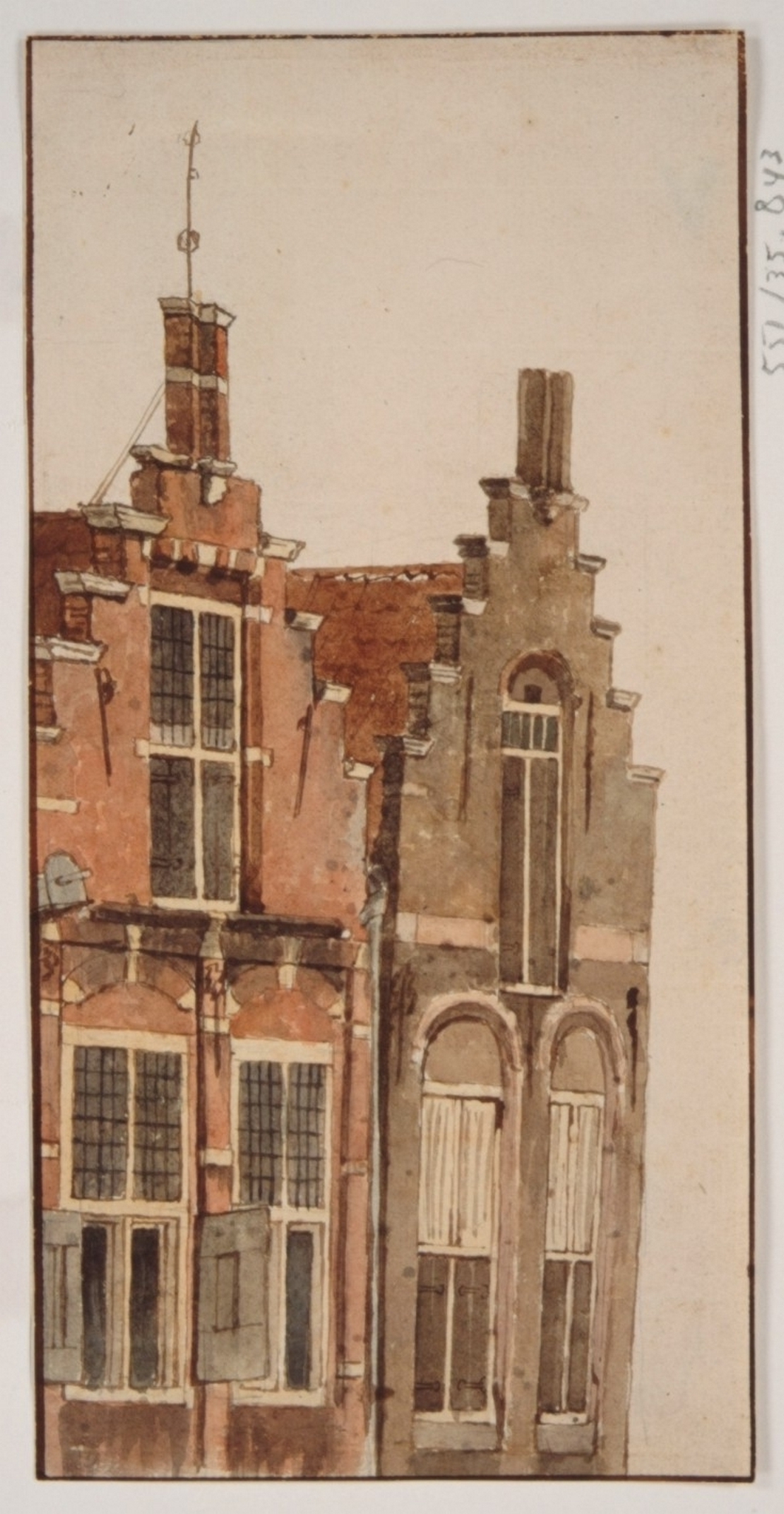 Varkenmarkt 31 en 29; bovengedeelten van de gevels, 1e helft XVIIe eeuw